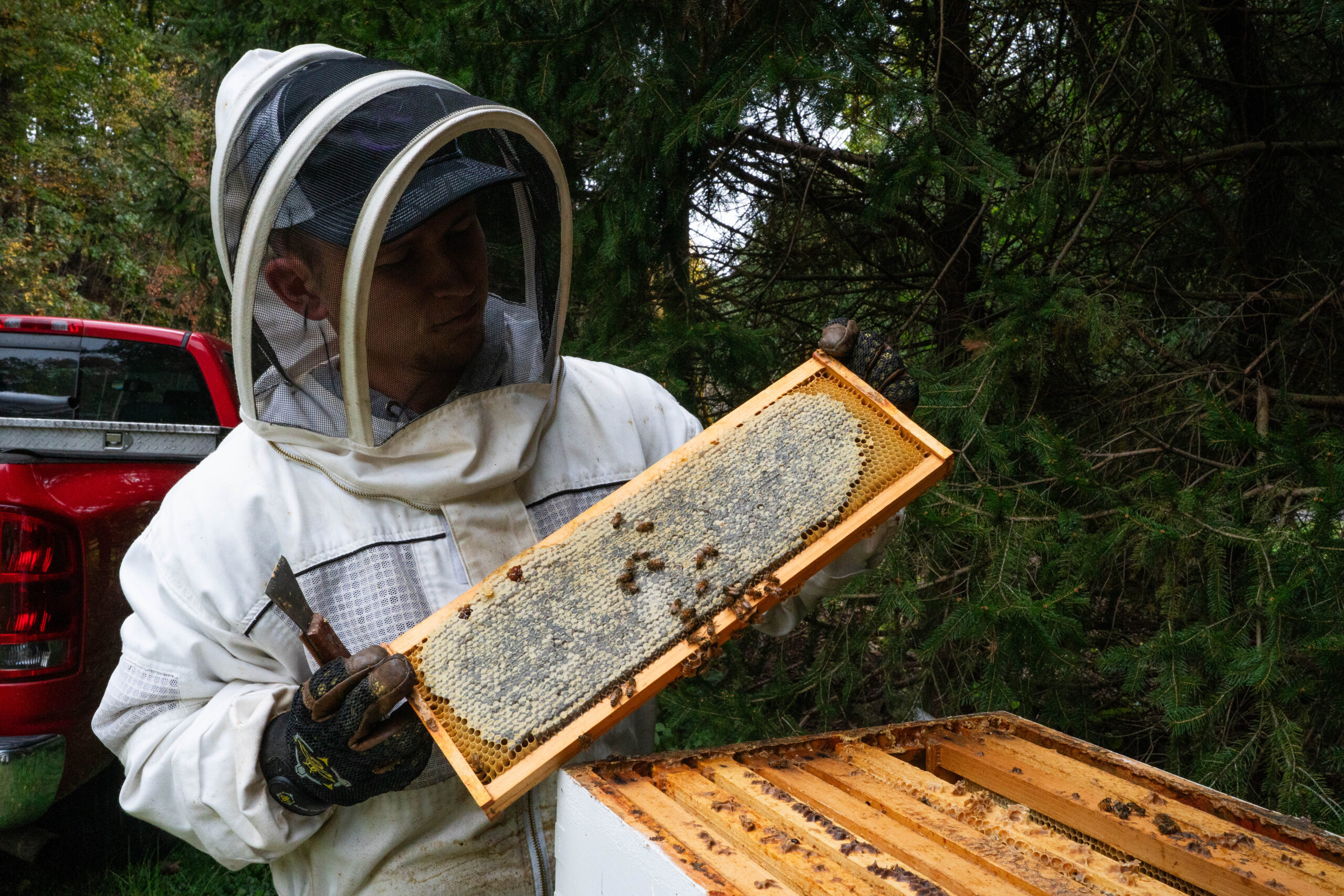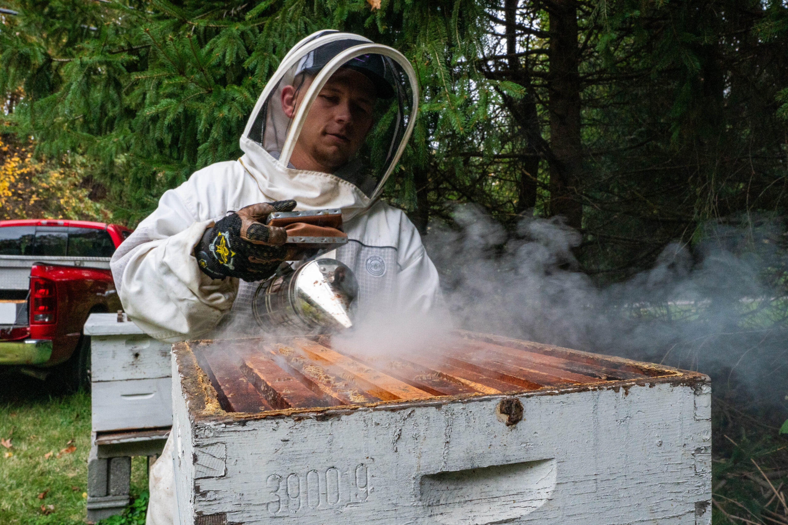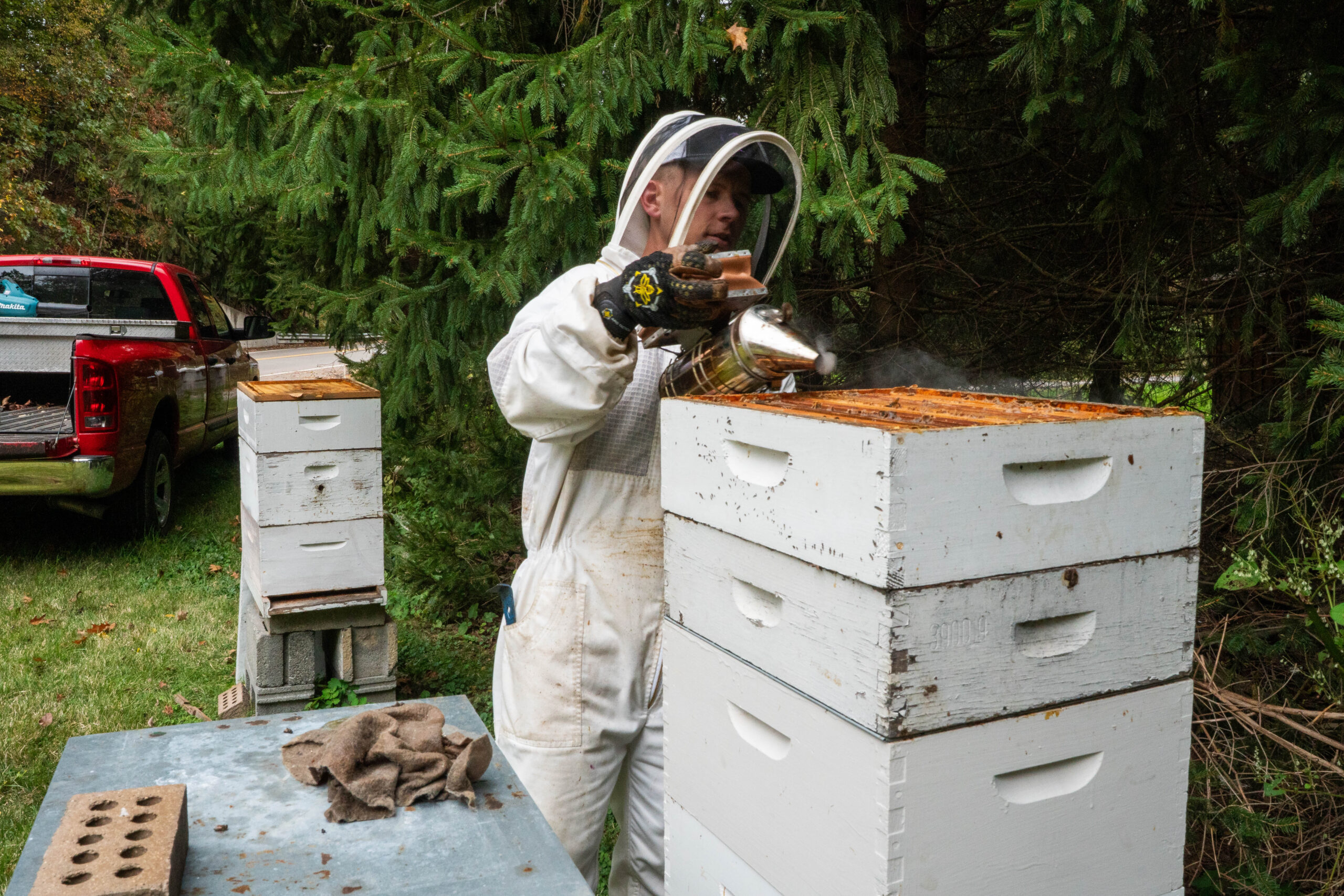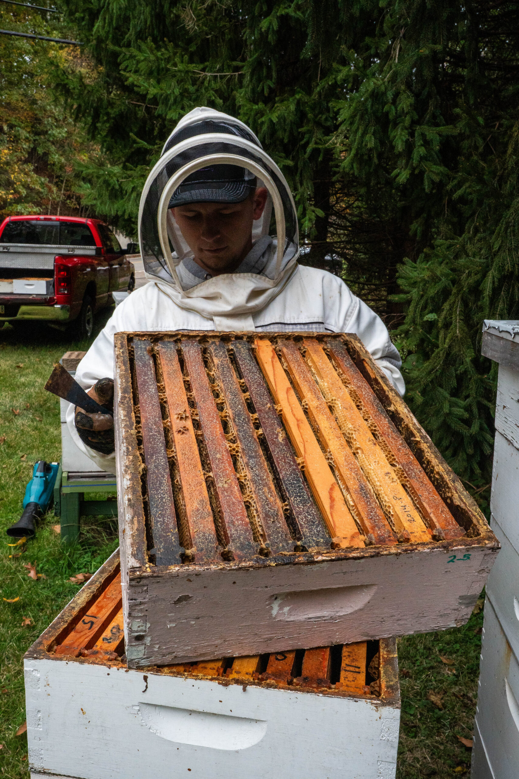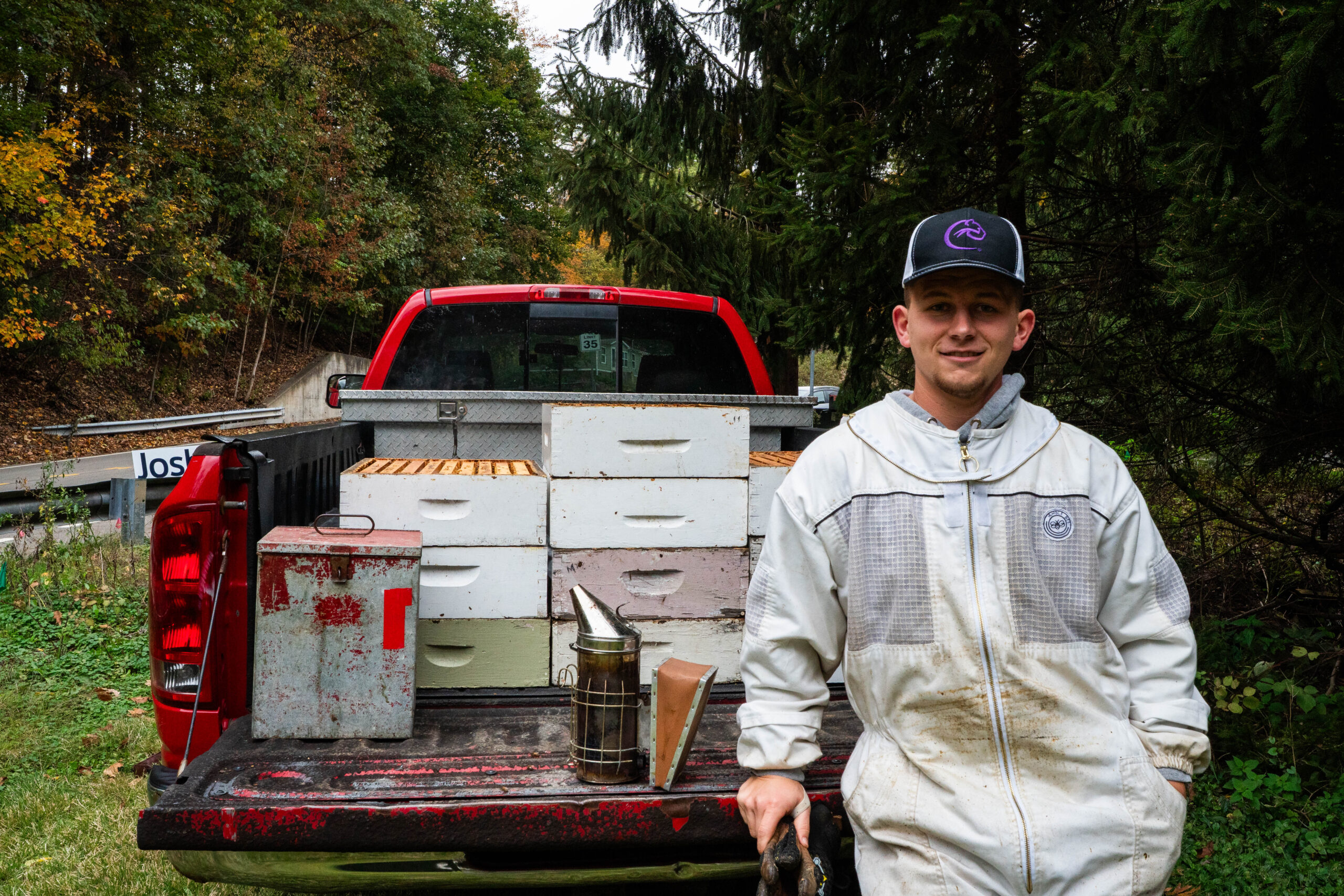 Today, he takes care of and harvests honey from 50 hives from Gibosnia to Blawnox, using the money from his honey sales to pay for his tuition at Chatham University.