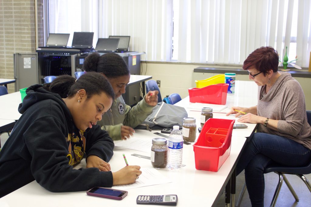 Ky’layaa Dobson and Brianah Adams, both seniors at East Technical High School, in Cleveland, work on a soil experiment with their teacher, Alys Virzi, Feb. 21. (Sarah Donaldson photo)
