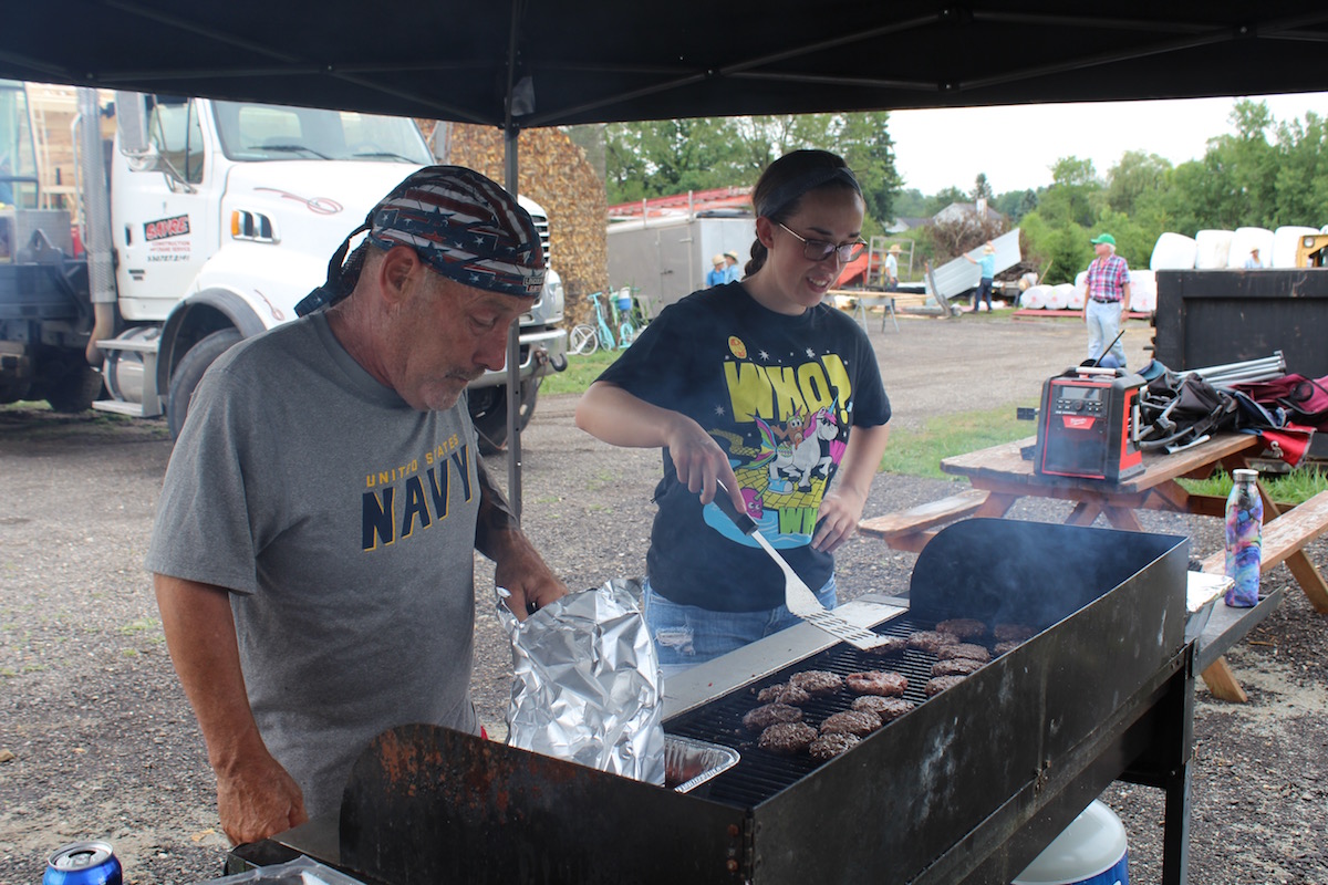 A donated tent, tables and chairs were set up in the backyard. Amy Taylor’s uncle, Edward Stanton, and his stepdaughter, Stacey Kovacic, cooked burgers and hot dogs to feed the dozens of workers at lunchtime.