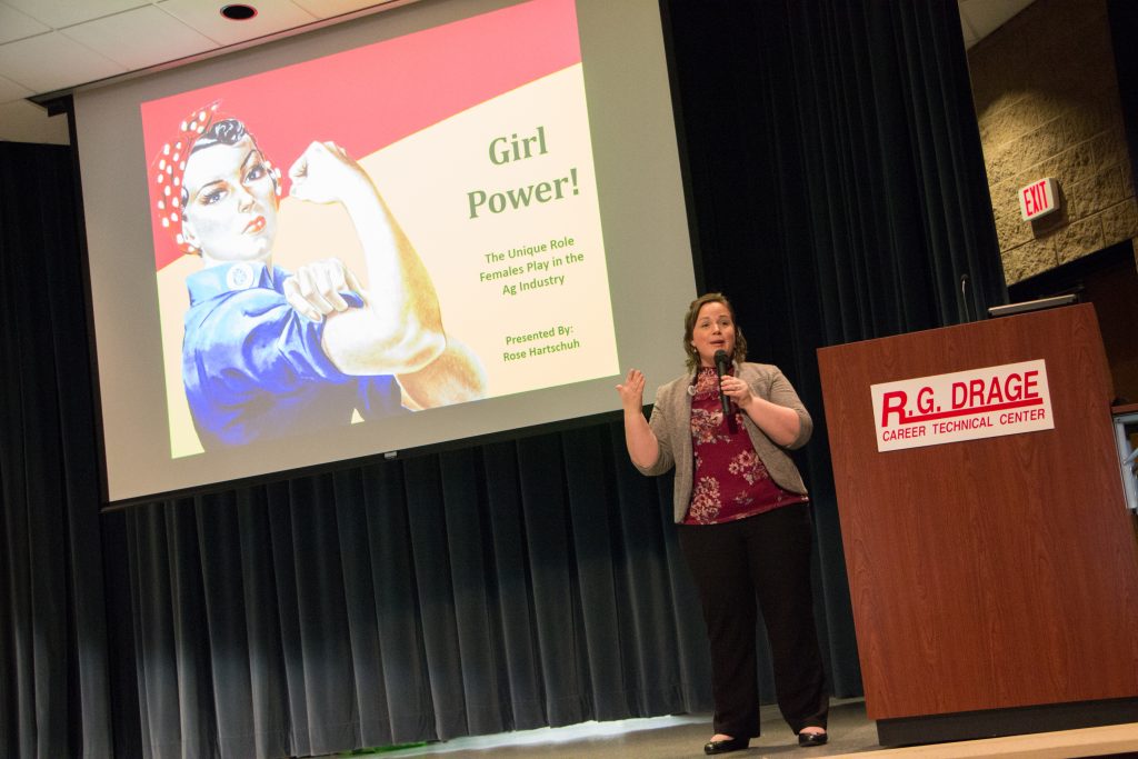 Finding your fit Everyone has a role in agriculture. Rose Hartchuch, farm wife, mom, business owner, and advocate or agriculture, was the keynote speaker for the 2018 Women in Agriculture Conference, April 6, in Stark County. Hartchuch shared that one-third of nation’s farmers are female and 60 percent of the next generation of farmers are female. She encouraged women to find what they are good at and passionate about, harness that skill and use it to find their unique role within the agriculture industry. (Catie Noyes photo)
