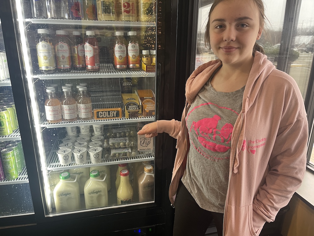 Ava Burrows points to her quail eggs for sale for the first time at "See You In Health," a local cafe and market in North Royalton, Ohio. (Submitted photo)