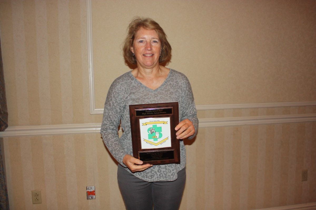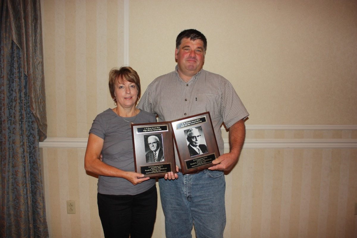 And Ohio Swiss breeders Ron and Renee Michalovich, of Lakeville, are raising some of the breed’s top producers. They received individual cow awards for the highest 305-day milk and fat production, on at 305-day test, milking twice a day. Their 4-year-old cow, RNR Supreme Janna, produced 42,410 pounds of milk; 2,870 pounds of fat at 6.8 percent; and 1,361 pounds protein, at 3.2 percent.