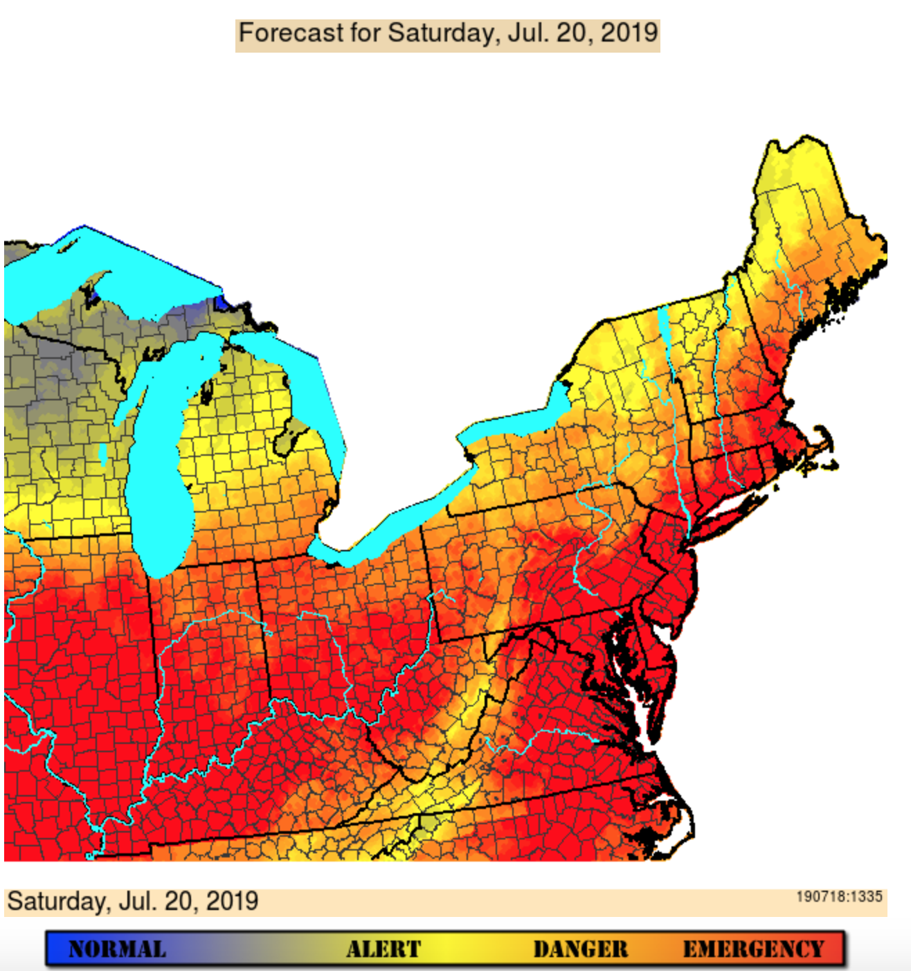 The U.S. Department of Agriculture’s cattle heat-stress forecast also shows the region is at risk of “dangerous” to “emergency” heat stress on July 19 and 20.