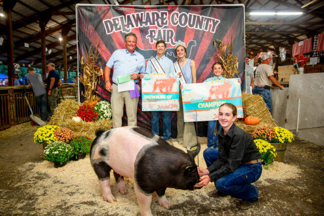 GRAND CHAMPION: Logan Lucas | Bid: $1,367.58 | Weight: 98 lbs | Buyer: Delaware Fair Directors; RESERVE CHAMPION: Benjamin Wood | Bid: $888.10 | Weight: 110 lbs | Buyer: Hiram Masonic Lodge No. 18