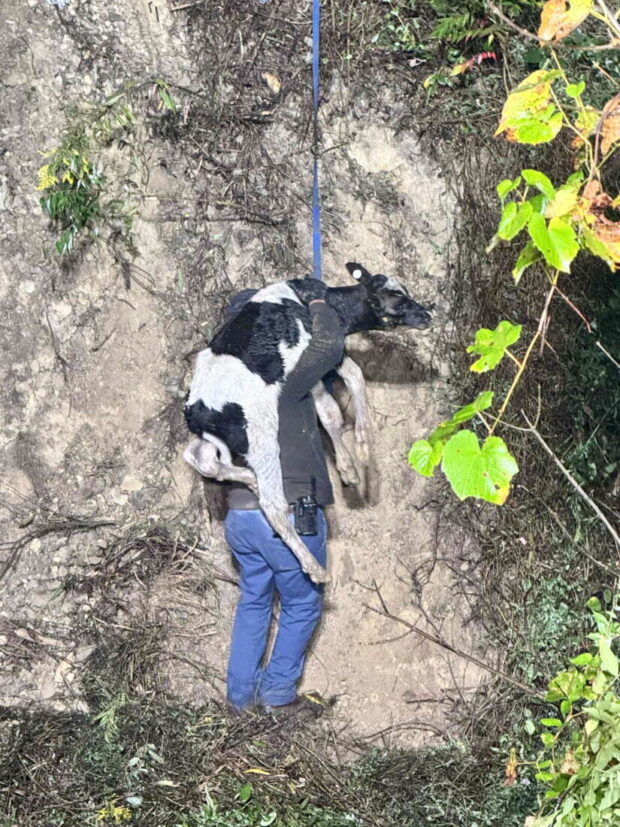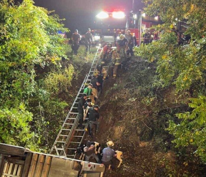Crews forded the creek and cleared brush to gain access to the trailer. The calves were then pulled from the trailer and carried up the embankment and passed from person to person to safety. Crews used ladders to get up the steep hill.
