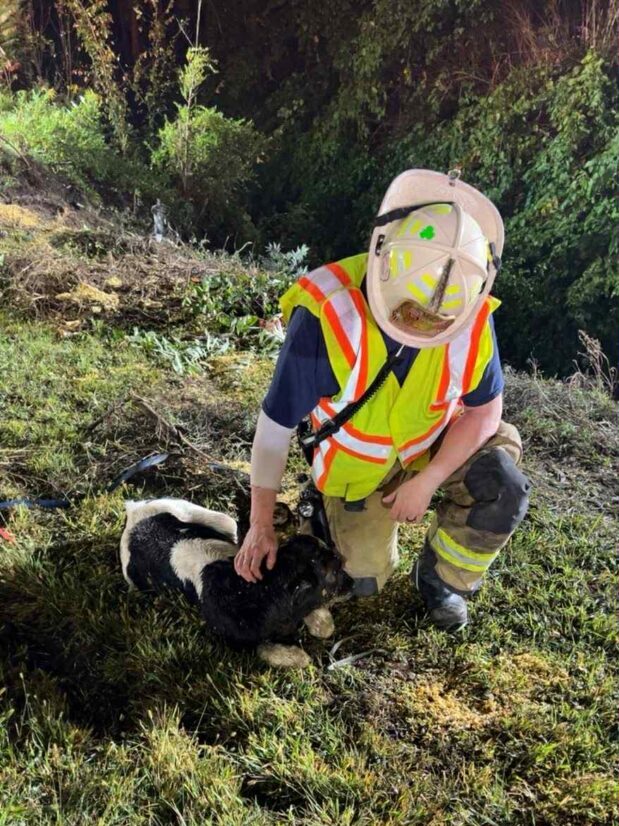 Many of the calves were rescued from the toppled trailer by being carried one by one up a steep embankment by first responders and farm workers, the fire department detailed in a Facebook post.