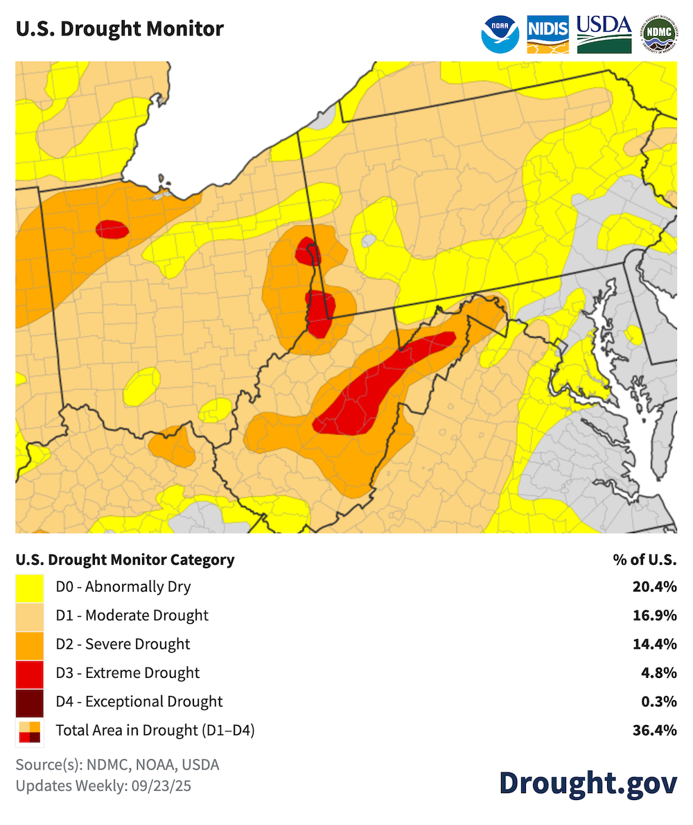 Nearly 95% of West Virginia is considered to be in drought, with counties in the northern panhandle and across a large swath of the central part of the state in extreme (D3) drought.