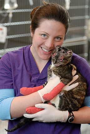 After a month of hospitalization, Dutchess’s burns were healing nicely, but she still needed more intensive care than her owners could provide, so her hospital stay continued, and she became a favorite of students and staff.