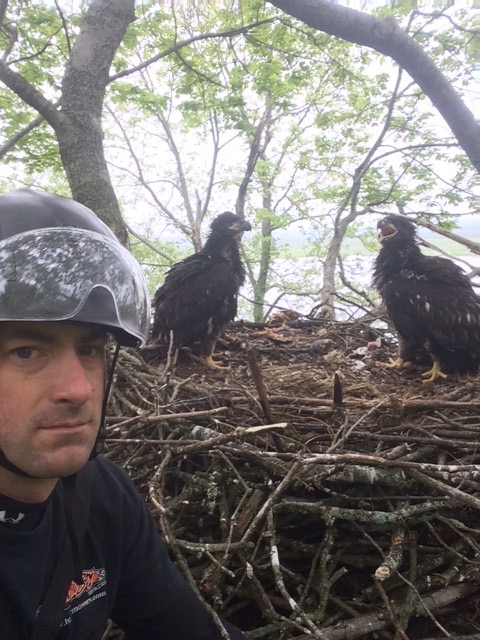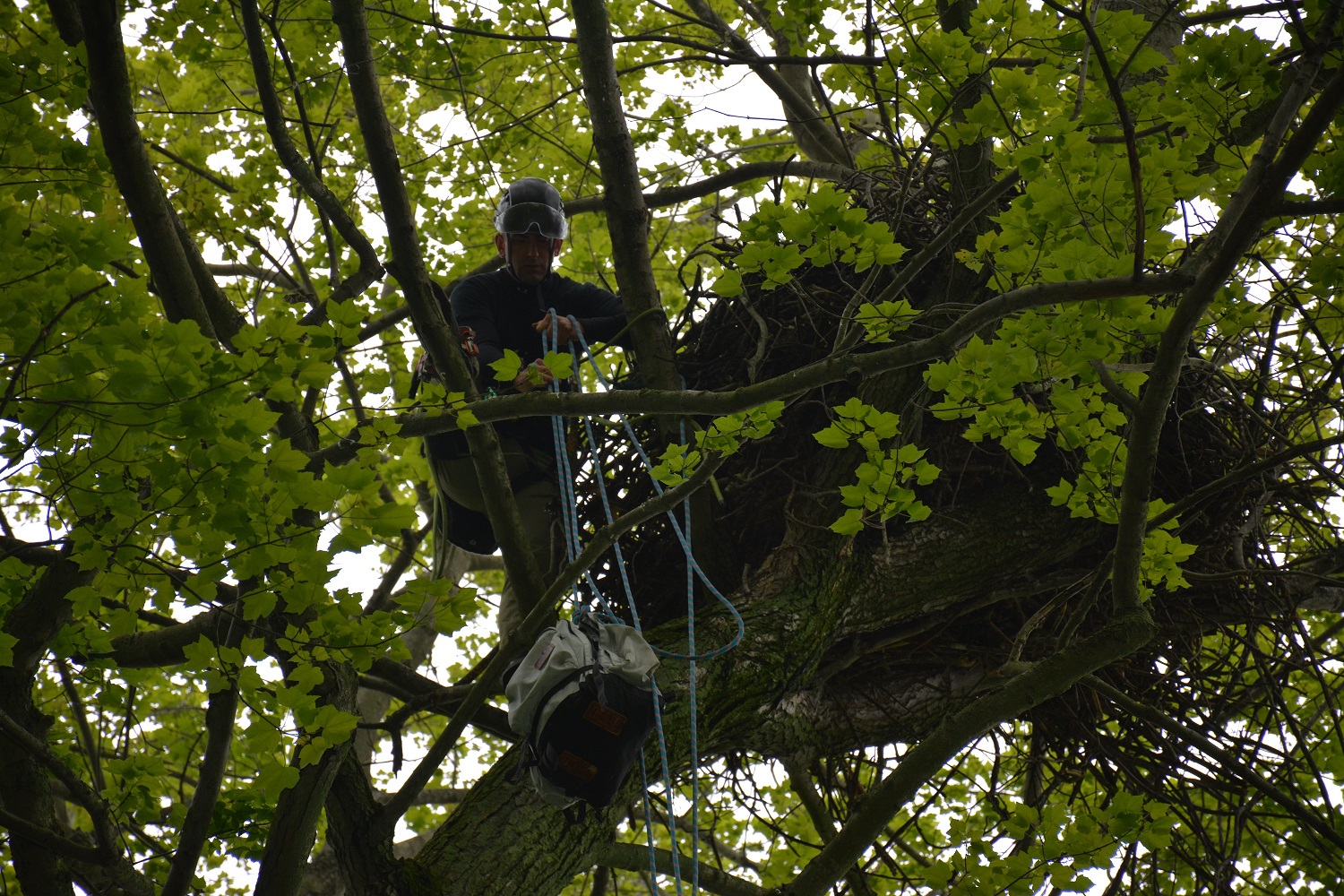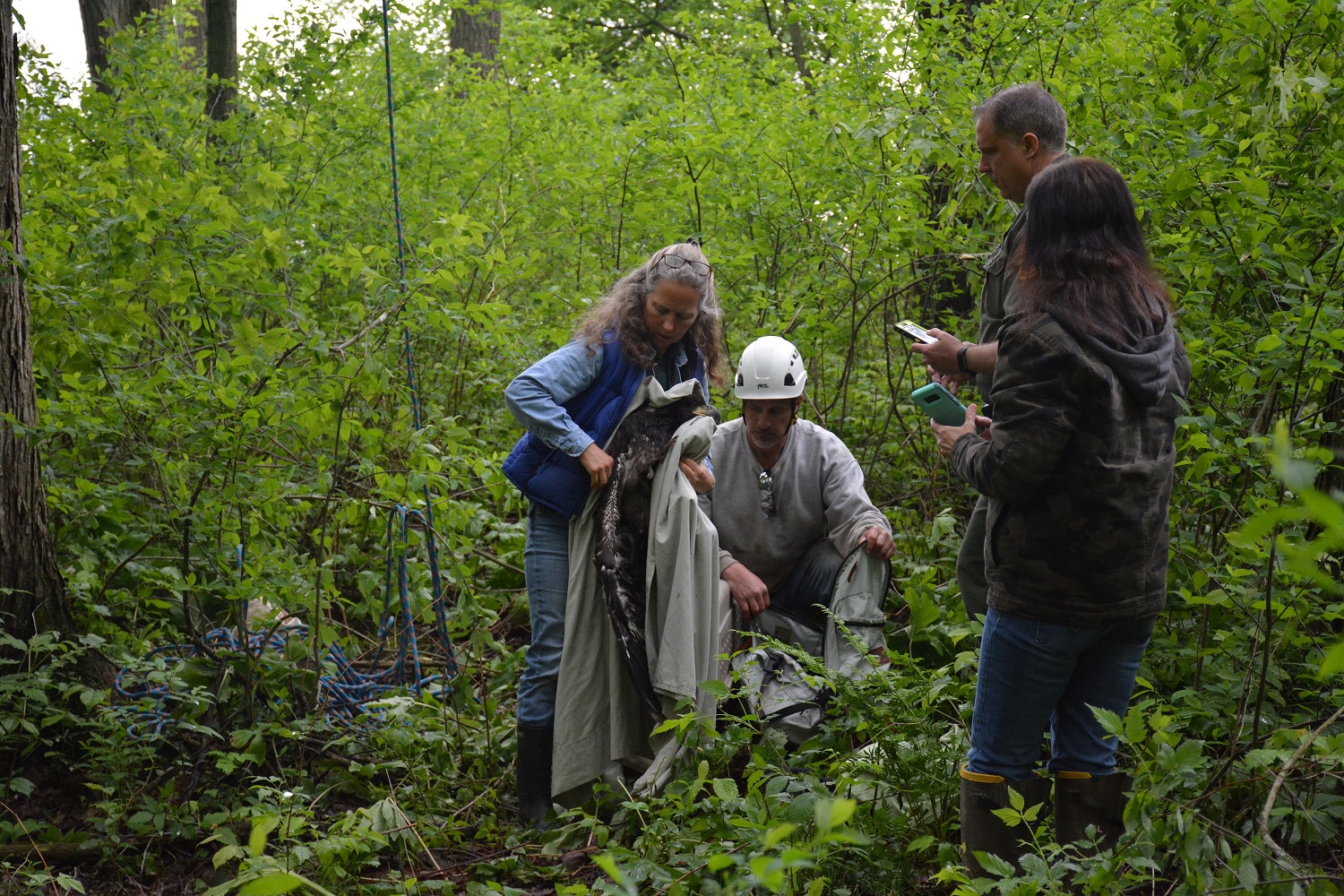 Hoppe ascended the large maple tree and pulled up the eaglet, which had been wrapped in a blanket and carefully placed in a heavy-duty backpack tied to a rope.