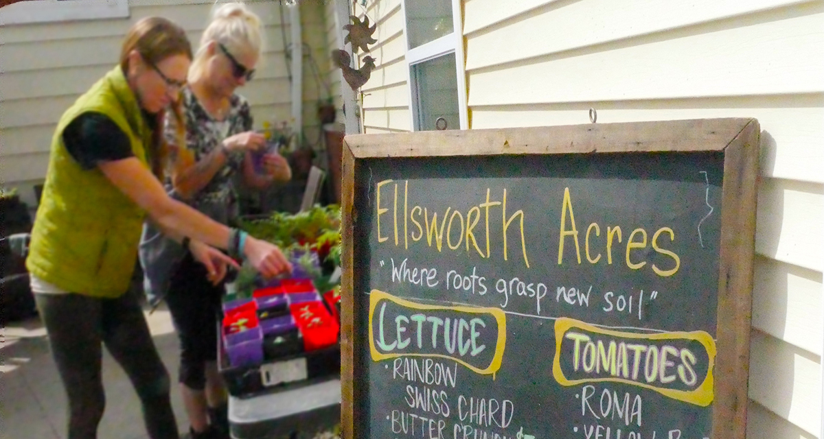 Two women stand next to table full of plants with sign in the foreground that says Ellsworth Acres