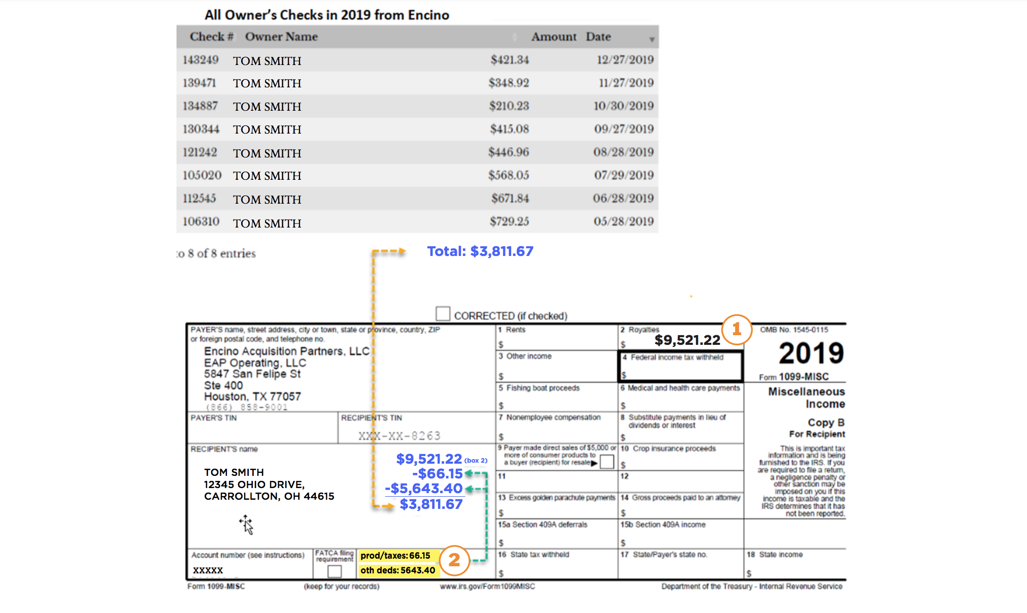 Encino also included the taxes and other deductions taken from the royalty payments in a smaller box on the bottom left section of the form.