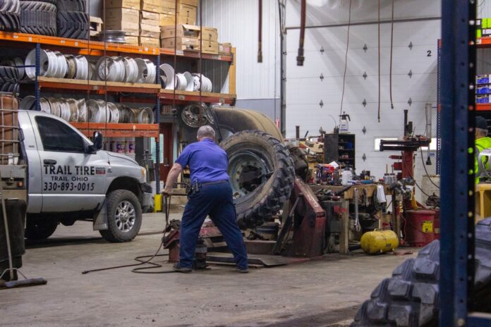 A Trail Tire employee changes a tire in the shop on May 22, 2025.