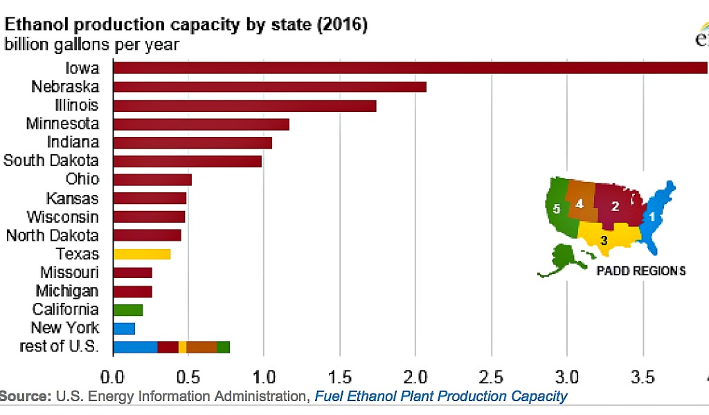 The majority of the 195 ethanol plants, and most of the U.S. fuel ethanol production capacity, are located in the Midwest. Of the top 13 fuel ethanol-producing states, 12 are located in the Midwest. Total nameplate capacity in the Midwest was 13.5 billion gallons per year (883,000 b/d), an increase of more than 500 million gallons compared with 2015.