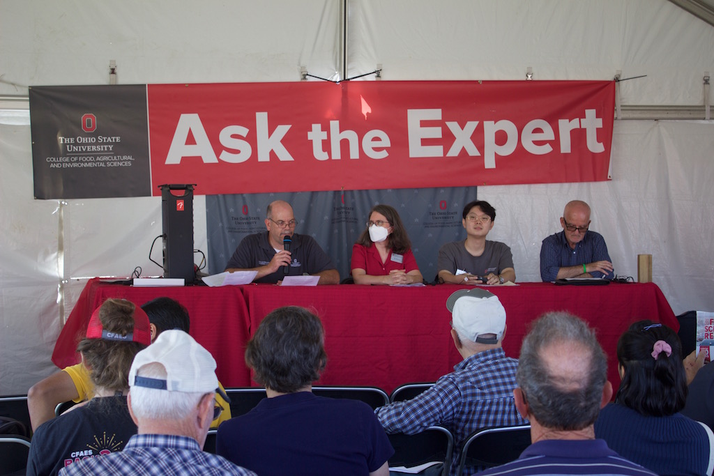 Chris Zoller, left, agriculture and natural resources extension educator for Ohio State University in Tuscarawas County, introduces panelists for Farm Science Review’s “Talk on Friday Avenue,” Ani Katchova, Seungki Lee and Ian Sheldon, all of Ohio State’s department of agricultural, environmental and development economics, Sept. 20, in London, Ohio. (Sarah Donaldson photo)