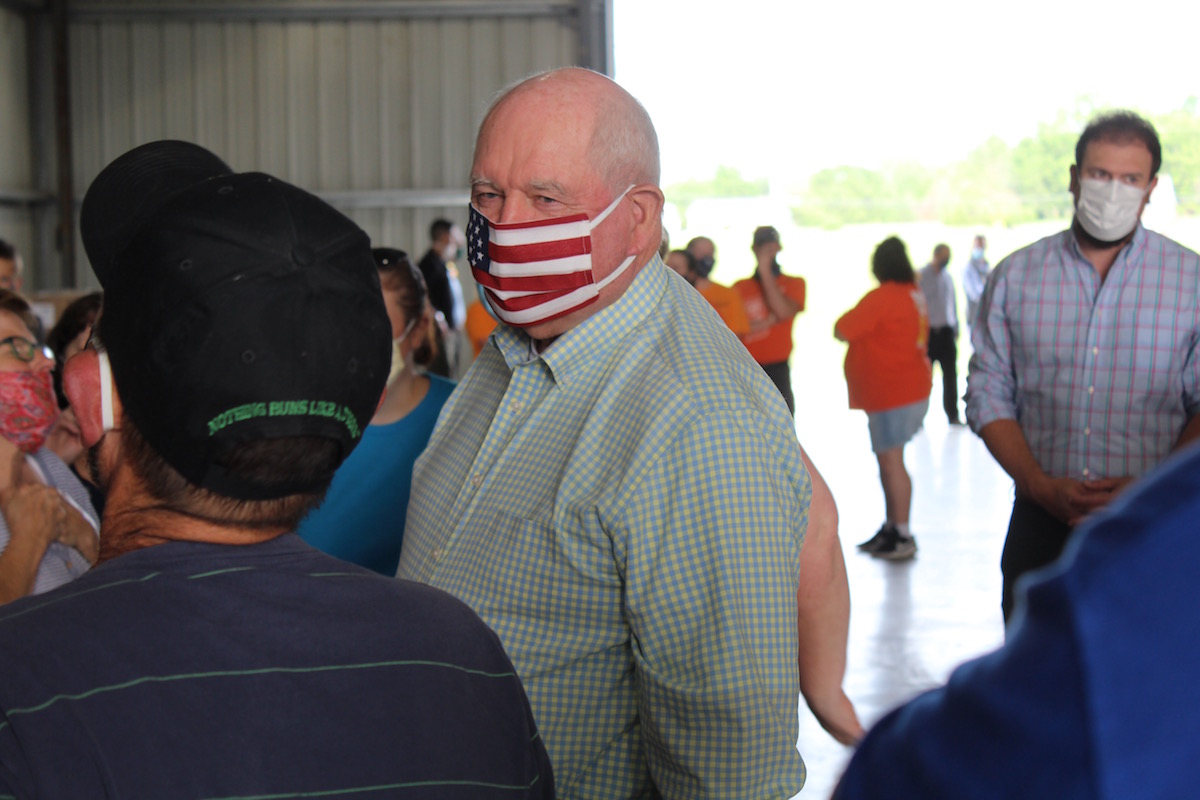 Agriculture Secretary Sonny Perdue talks to members of the Westmoreland County Fair Board before a mass food distribution begins May 27, at the Westmoreland County Fairgrounds. (Rachel Wagoner photo)