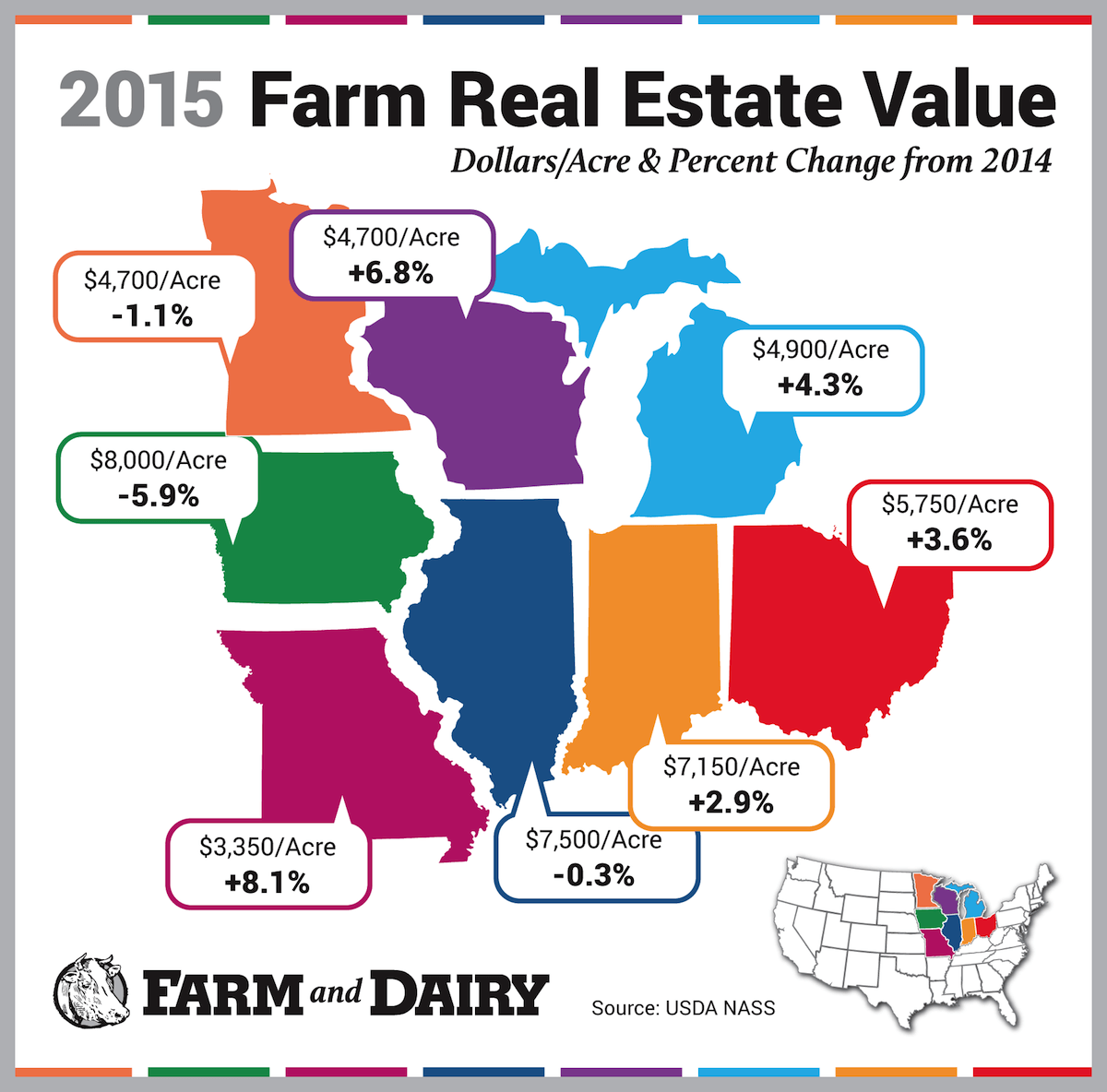 In Pennsylvania, farm real estate actually decreased by about 1.8 percent, to average $5,500 per acre, but cropland increased by one percent, to reach $5,900 an acre.