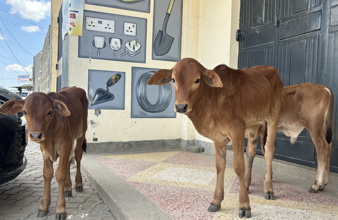 In Kenya, calves wander past roadside shops, the pastoralist herding them just behind. (Jake Zajkowski photo)