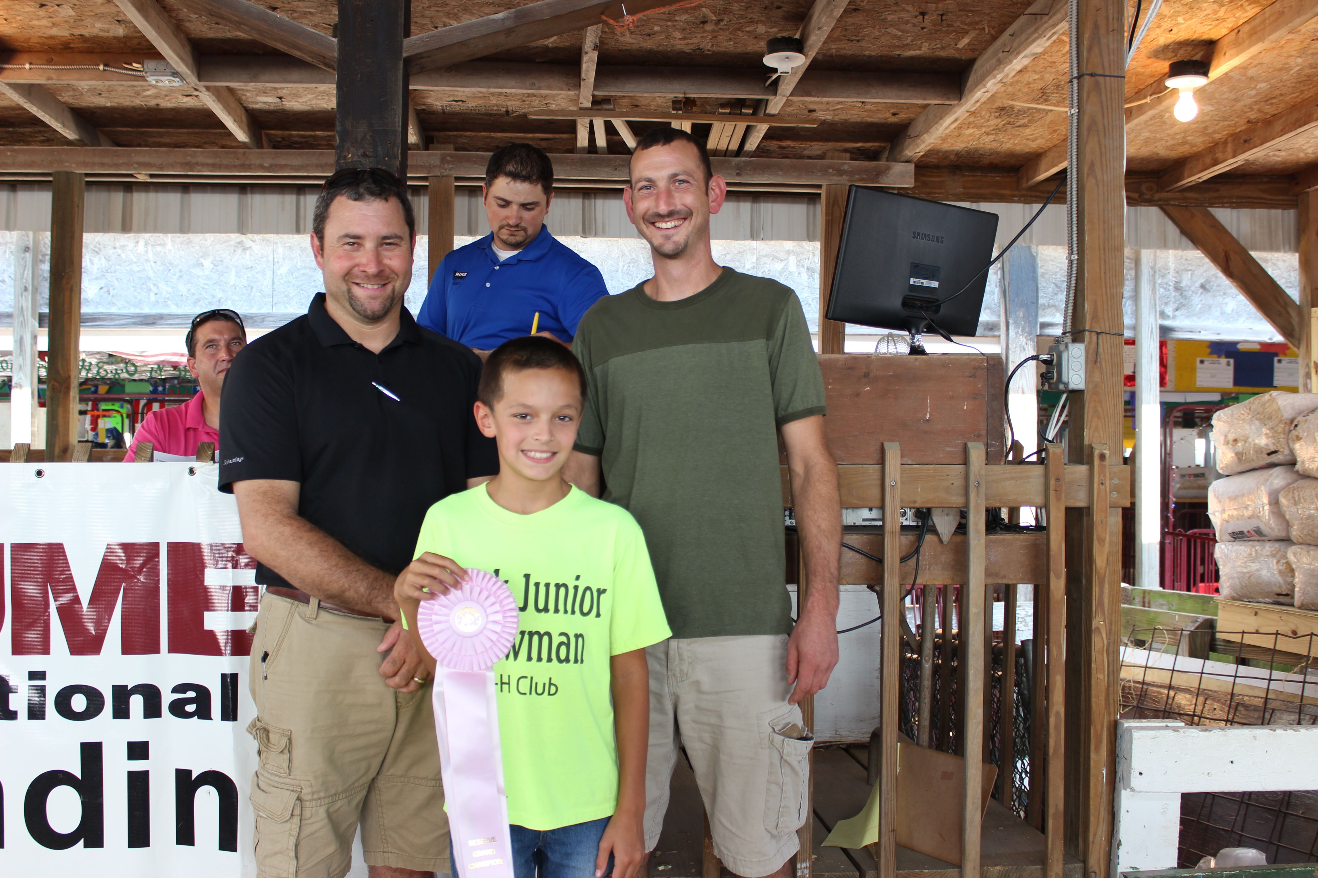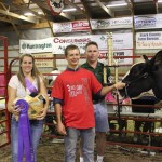 Logan Skolosh received a $6 a pound bid from Bishop Construction, Inc. for his 580-pound reserve champion dairy feeder. Pictured from left are Mark Skolosh, Mark Bishop, and Logan Skolosh.