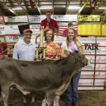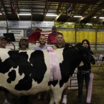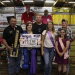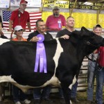 Dharma Varner’s 1,389-pound grand champion dairy steer sold to Eslich Wrecking, Factory of Terror and Enviroscapes for a bid of $4.25 a pound. Pictured from left are Todd Pugh and Anna Pugh of Enviroscapes; Rich Eslich, Sr; Rich Eslich, Jr.; Junior fair king Dean Rummell; and Junior fair princess Brooke Bishop.