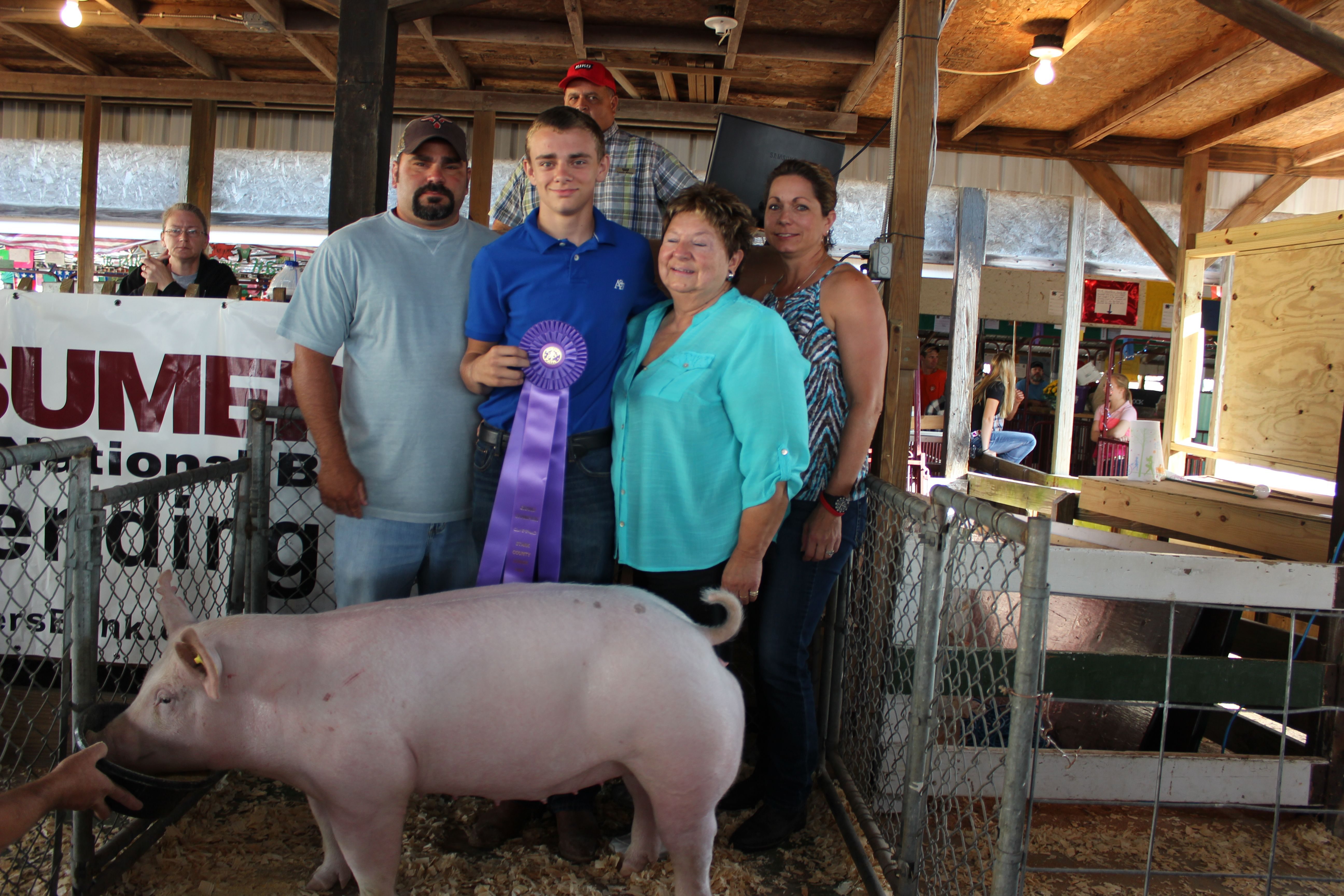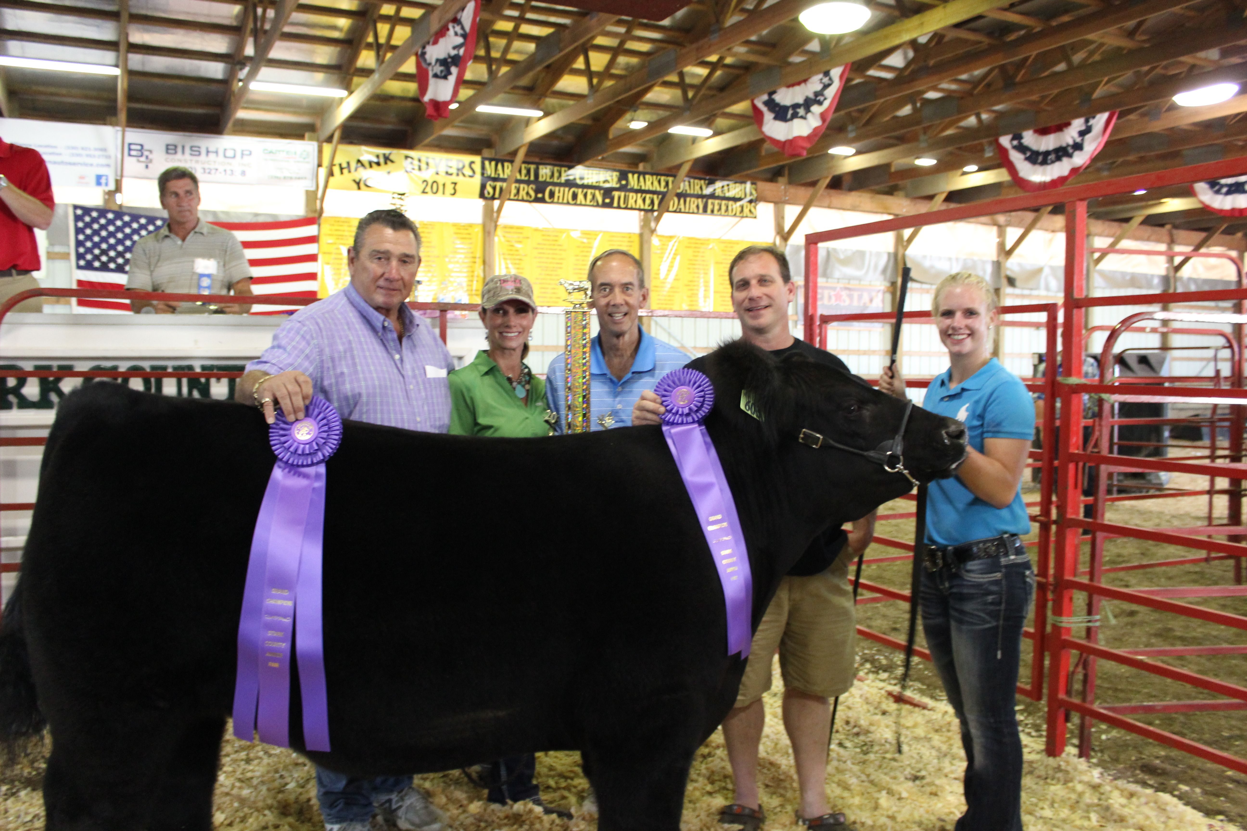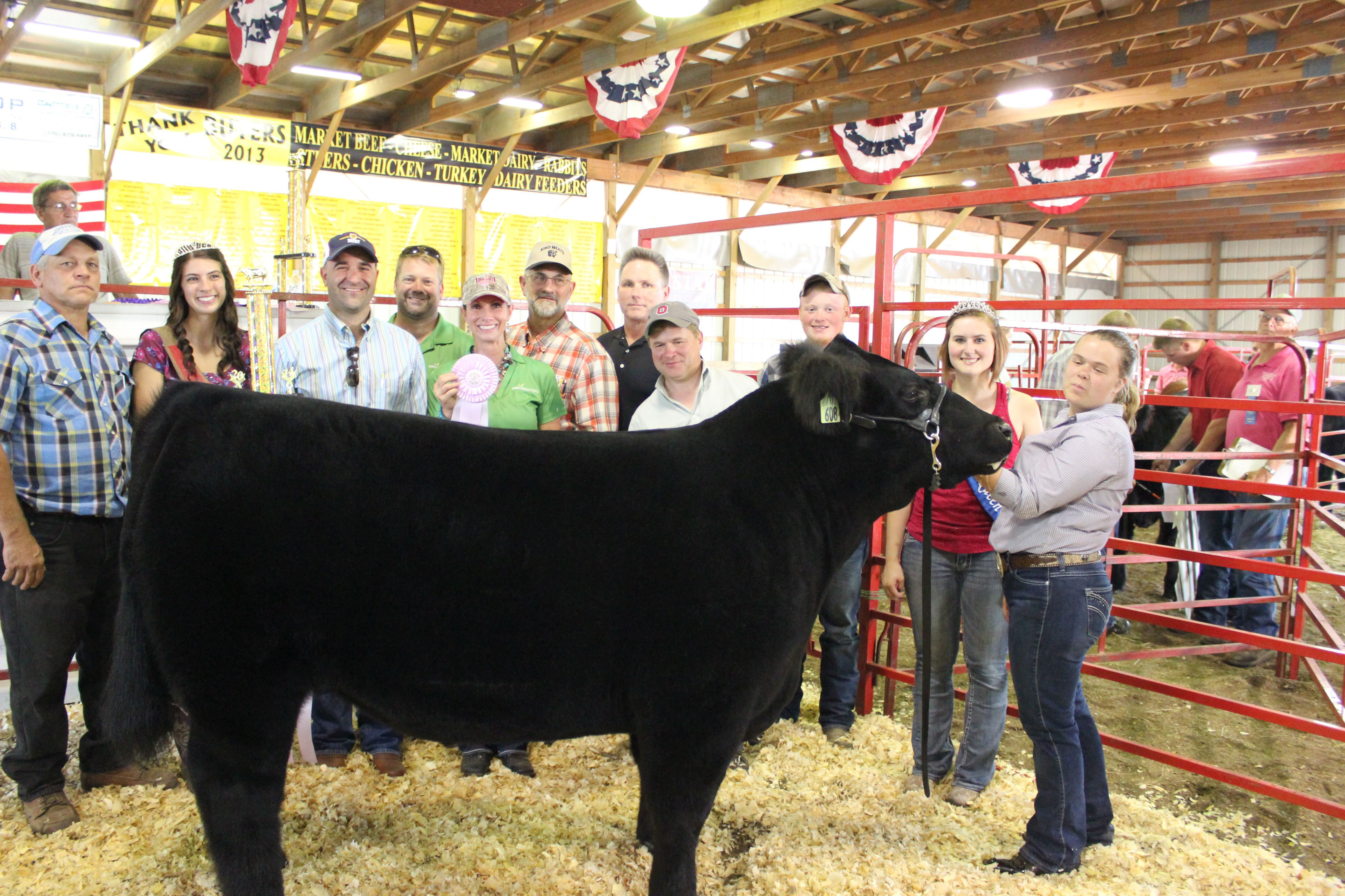 Brooke Bishop sold her 509-pound grand champion dairy feeder to John and Sally Deininger of Wooded View Farms for a record-setting $8.50 a pound.