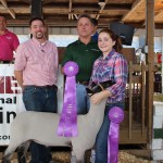 Natalie Frank’s 138-pound grand champion lamb sold to Paris and Washington Insurance and Pole Barns Direct LLC, Dutchcraft Truss & Metal Inc. for $22 a pound. Pictured from left are Reggie Stoltzfus of Dutchcraft Truss & Metal Inc/Pole Barns Direct, Kelly Palmer of Paris and Washington Insurance, and Natalie Frank.