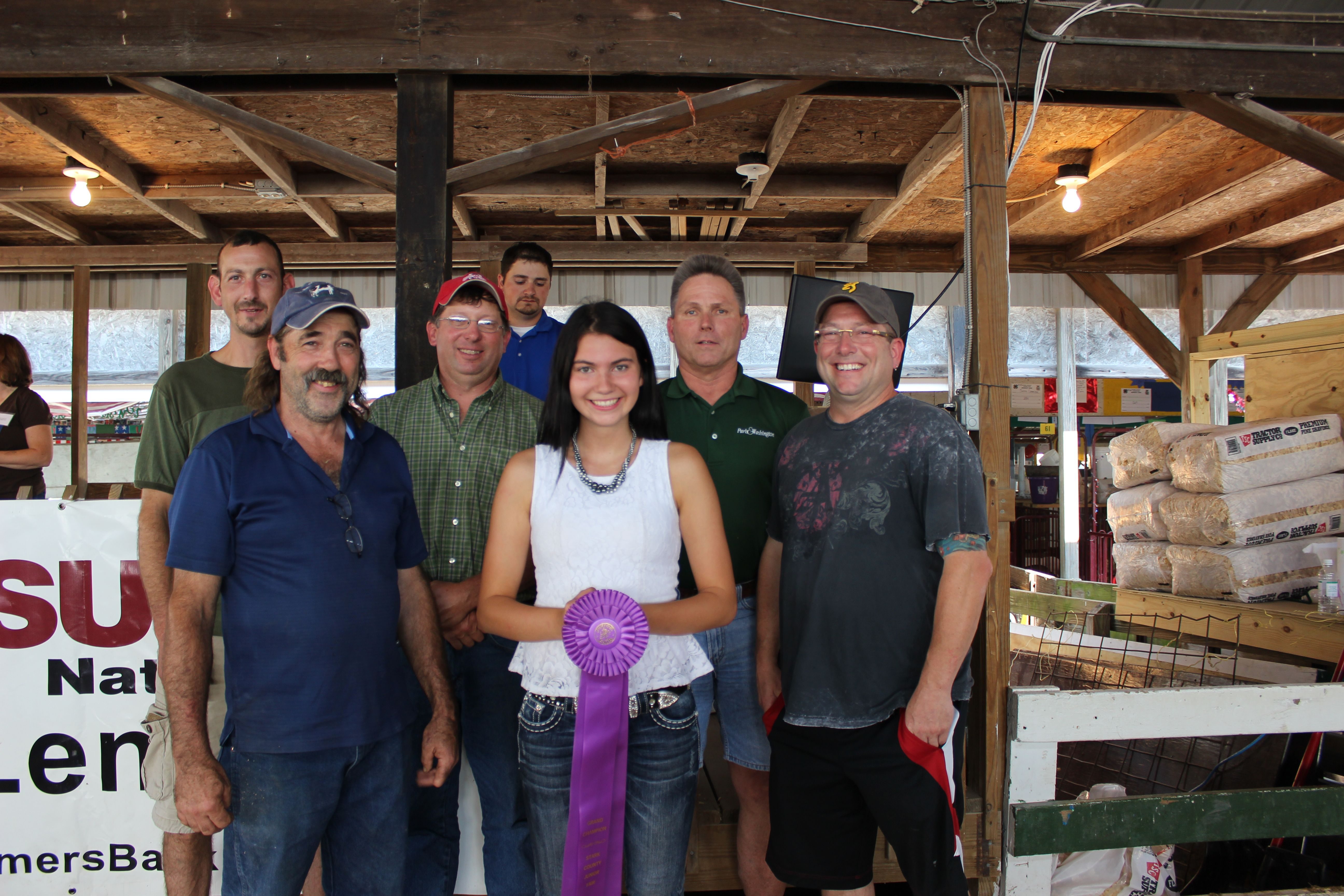 Tatianna Varner sold her 129-pound grand champion lamb carcass for $16 a pound to Paris and Washington Insurance, Kiko Meats, Ramsey Hoof Trimming, Village Farmhouse, and Wallace Farms Feed Drive Thru. Representing the buyers are, from left, Steve Kiko, Joe Ramsey, Paul Wallace, Kelly Palmer, and Chris Palmer.