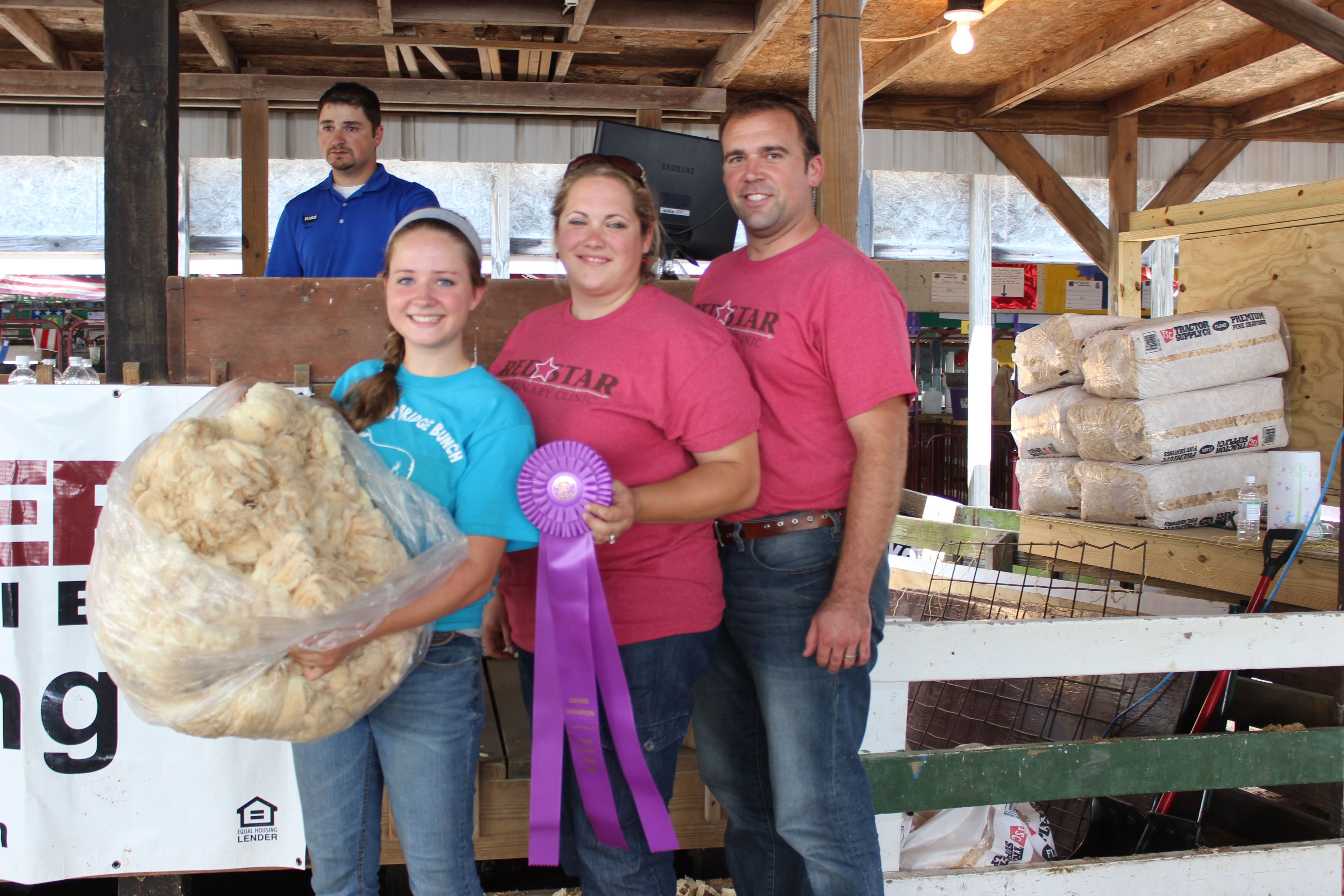 Sarah Shilling’s grand champion wool fetched $200 from Red Star Vet Clinic. Pictured are Dr. Trish Puugh-Pennell and Andy Pennell.