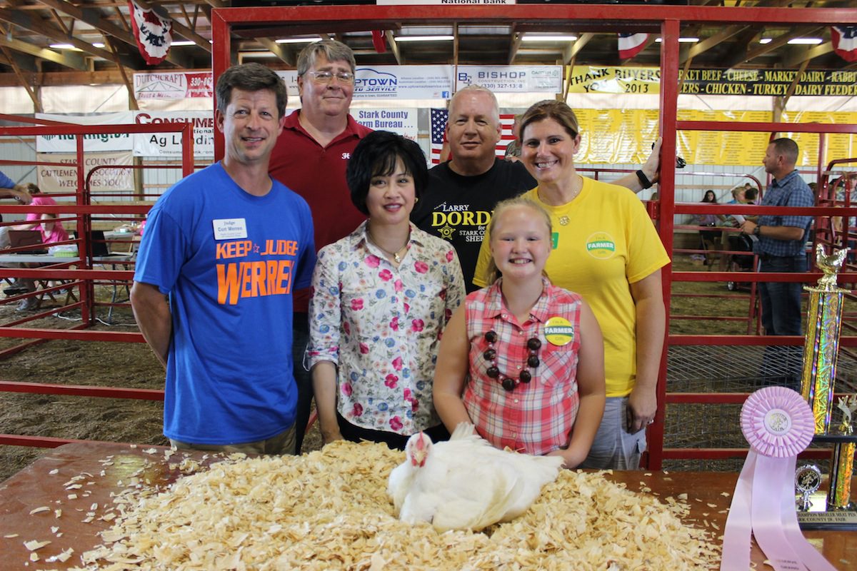 Lydia Beltz’s reserve champion chicken pen fetched a $1,70 bid from buyers (from left) Stark County Common Pleas Judge Curt Werren, John Hagan of Hagan Heating and Plumbing, Stark County Probate Judge Dixie Park , Stark County Sheriff candidate Larry Dordea, Lydia Beltz, and Stark County Common Pleas Judge Kristin Farmer. Not pictured, Ohio State Rep. Christina Hagan.