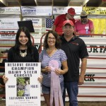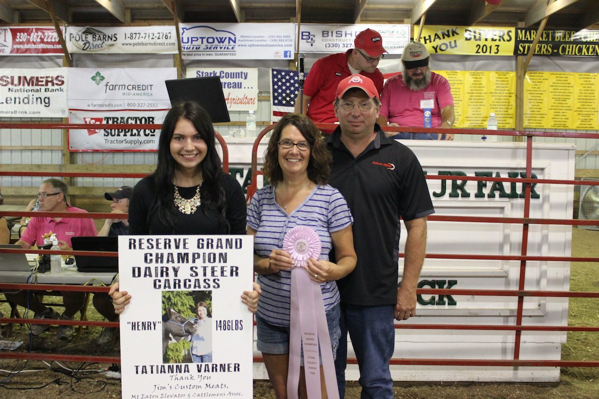 Tatianna Varner’s 1486-pound reserve champion dairy steer carcass was sold to Wallace Farms Feed and Drive-thru for $1.50 a pound. Pictured from left are Tatianna Varner, Jennifer Wallace and Paul Wallace.