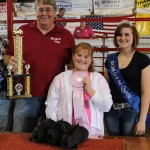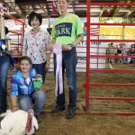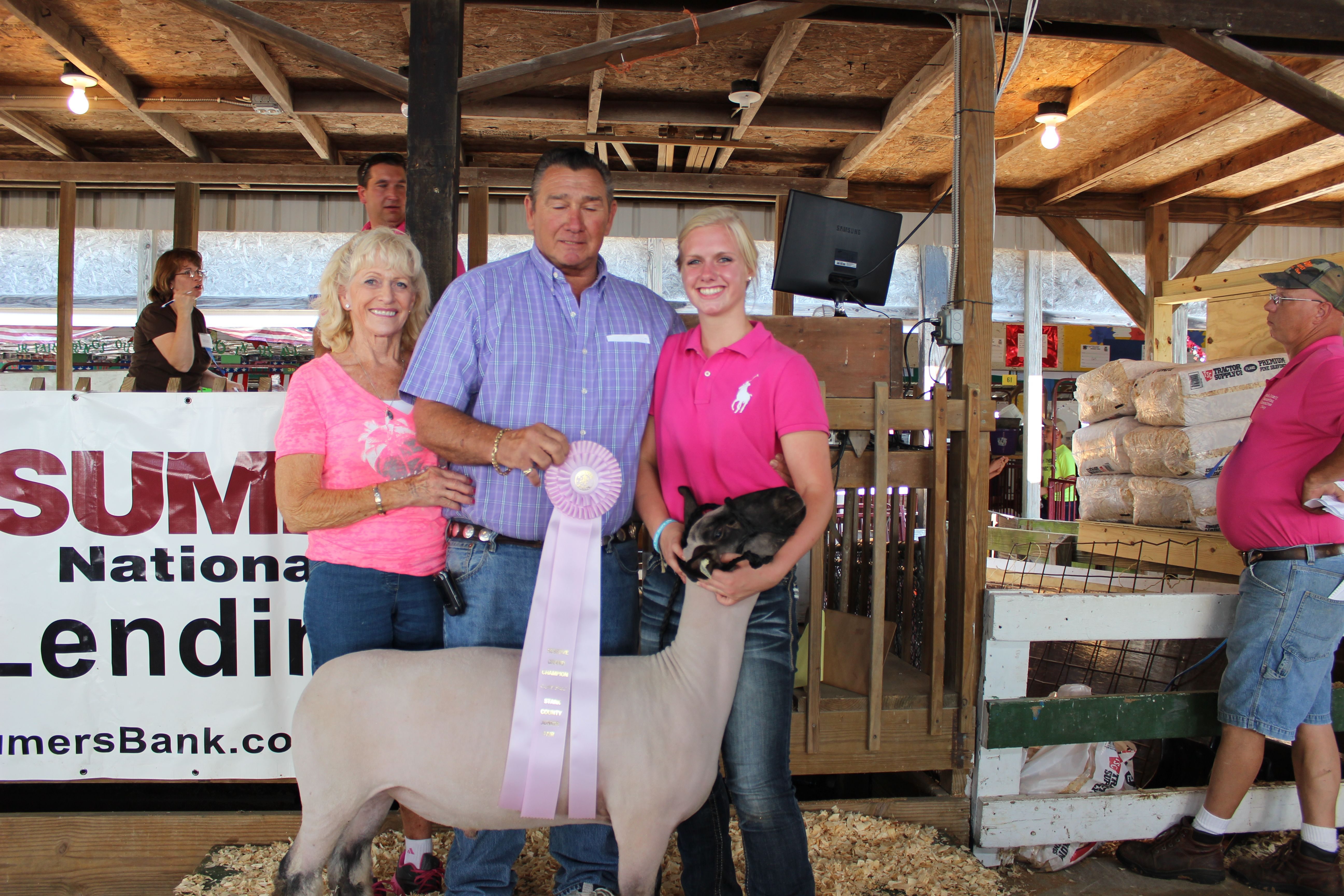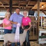 Lindsey Pugh sold her 140-pound reserve champion lamb to Eslich Wrecking for $23 a pound. Pictured from left are Elizabeth Eslich, Richard Eslich, and Lindsey Pugh.