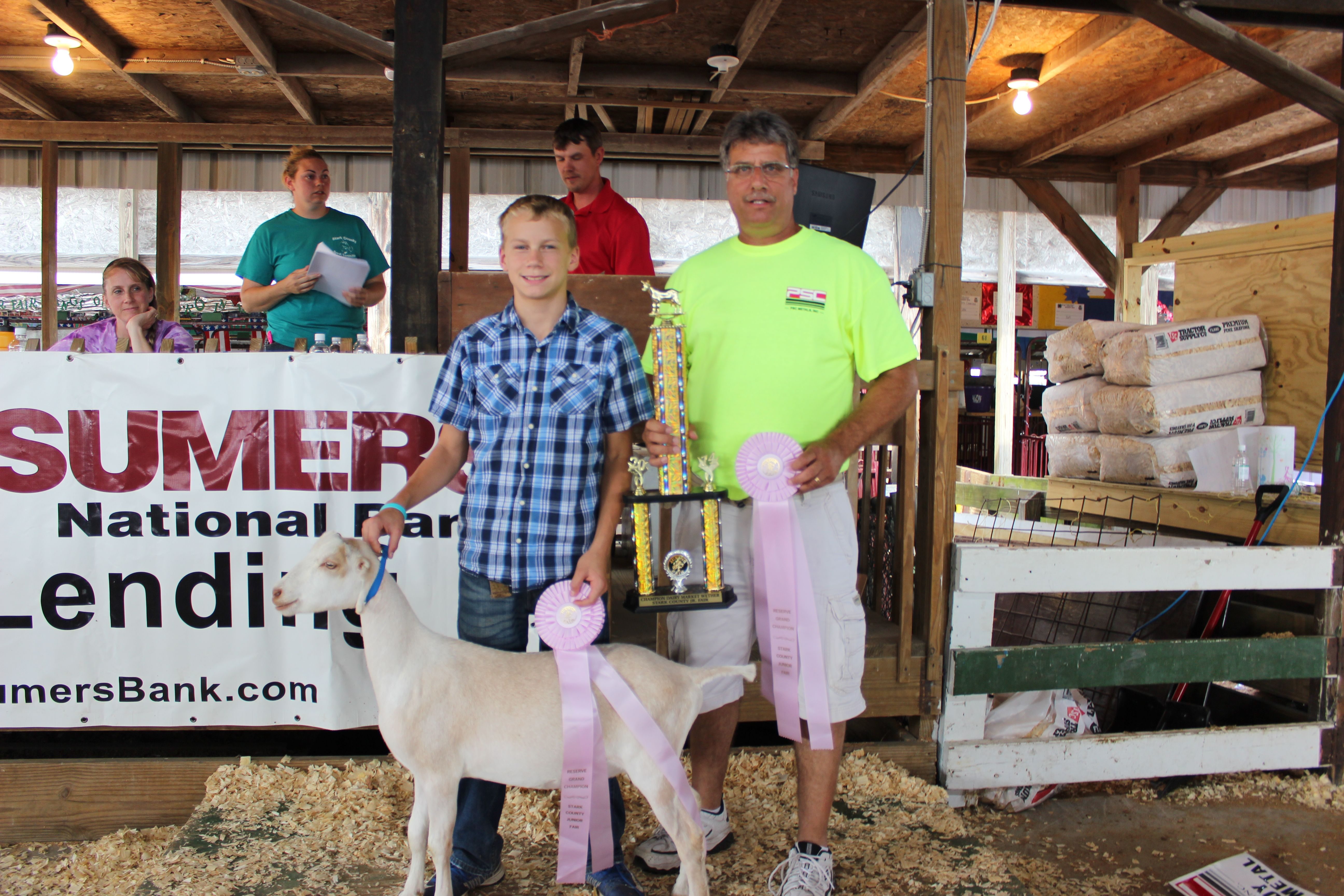Bryce Snow’s 68-pound reserve champion dairy wether was purchased by PSC Metals for $5 a pound. Pictured with Bryce Snow is David Casalinova of PSC Metals.
