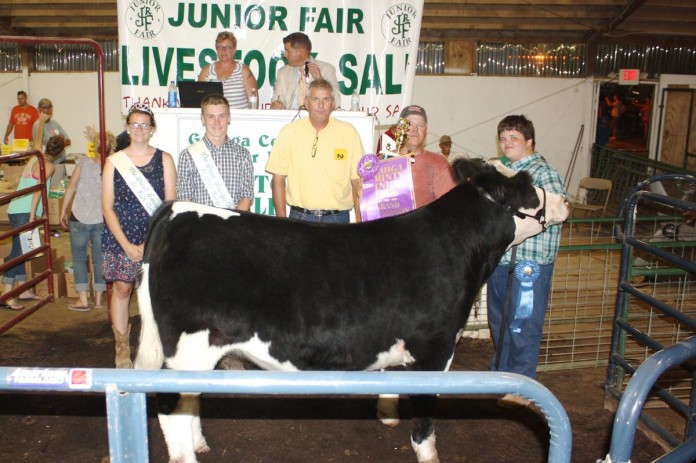 Jacob Carver’s 1,316-pound grand champion steer sold for $6.50 a pound to Oscar Brugmann Sand & Gravel, represented by Todd Brugmann. Also pictured are fair royalty Josh Loveland and Kelli Briggs.