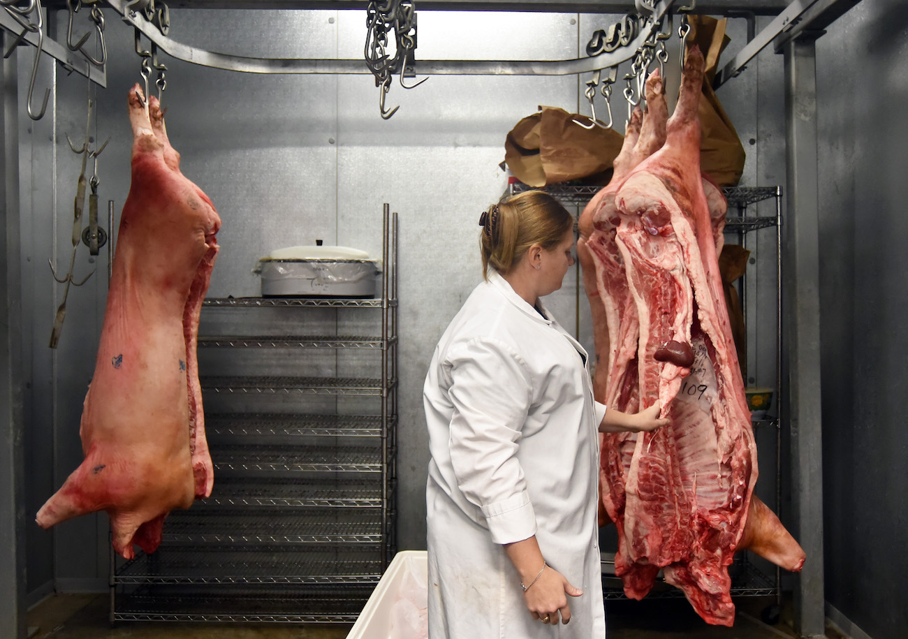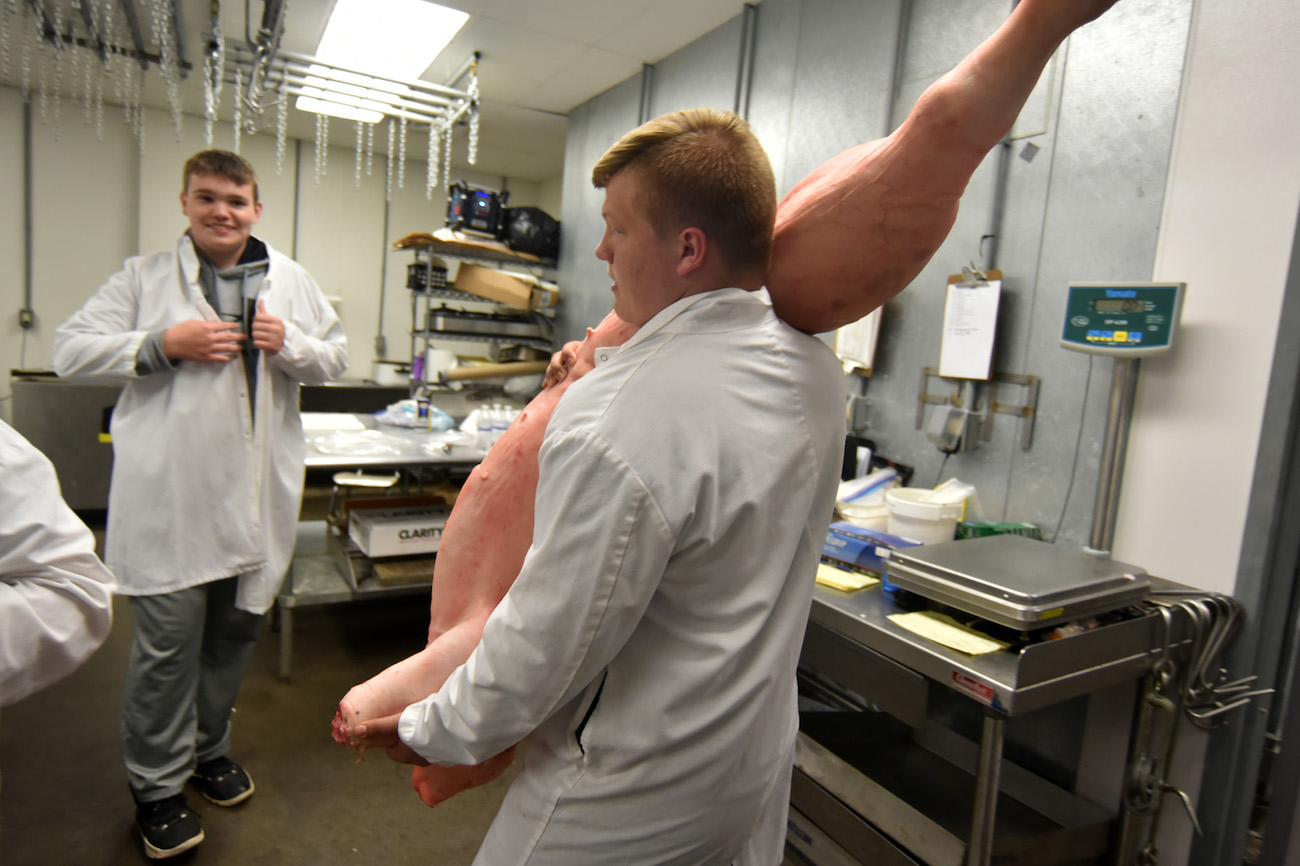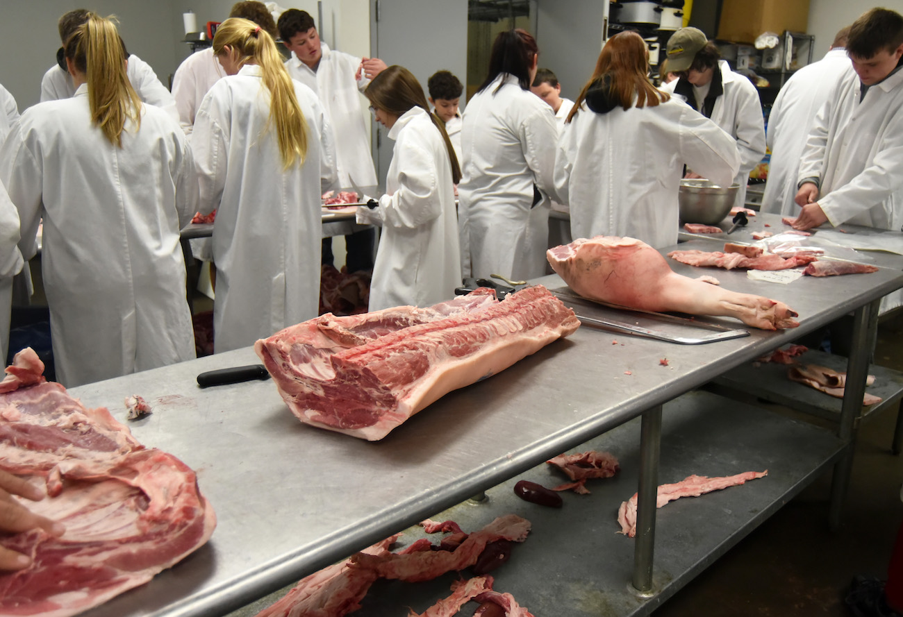 This year 35 Tyler students raised 73 hogs that will be processed at the school’s meat lab into hams, bacon, pork chops and sausage. The hams and bacon are auctioned off at a sale in March, with proceeds going back to the students.