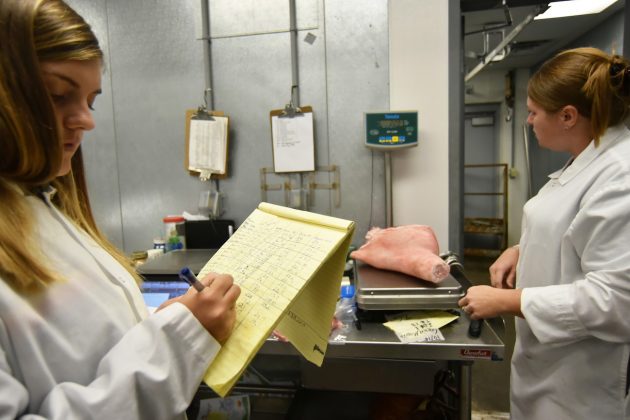 The district built a meat lab, complete with two walk-in coolers and a walk-in freezer, in 2005 for the animal processing classes and the FFA’s ham and bacon program.
