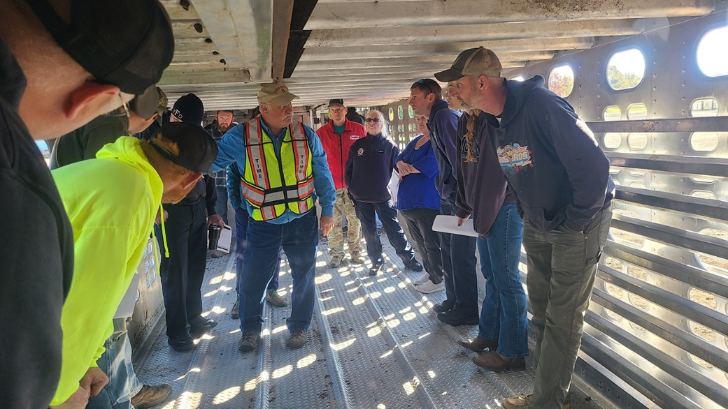 Stephen Boyles, a professor of animal sciences with Ohio State University, talks to a class of first responders in a livestock trailer, Oct. 22, at the Bloomfield Livestock Auction. (Submitted photo)