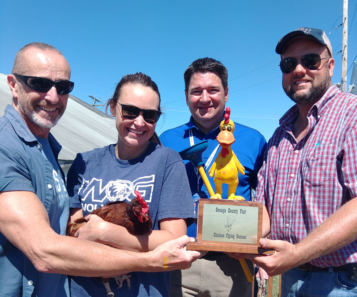 Meagan Bellan, the substitute principal of West Geauga Middle School, won the chicken flying contest at The Great Geauga County Fair Sept. 1. Pictured from left to right are West Geauga Local Schools Superintendent Richard Markwardt, Bellan (holding the winning chicken, of course), Geauga County Prosecutor Jim Flaiz and Bob Rogish of the Geauga County Farm Bureau. Photo credit: David Somrack.