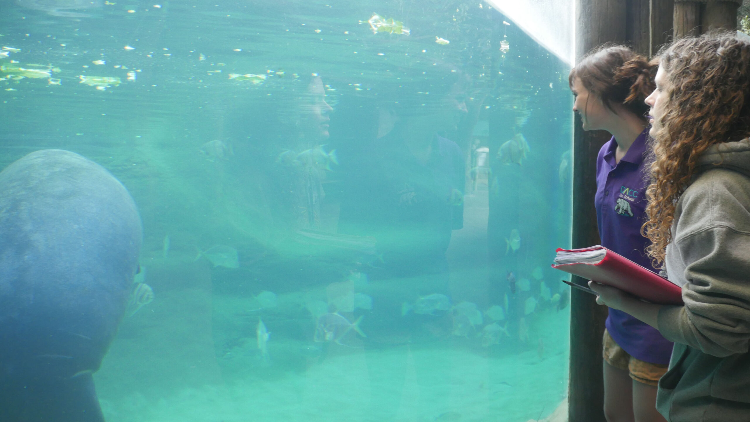 Two students look at a manatee in a large aquarium at the Columbus zoo
