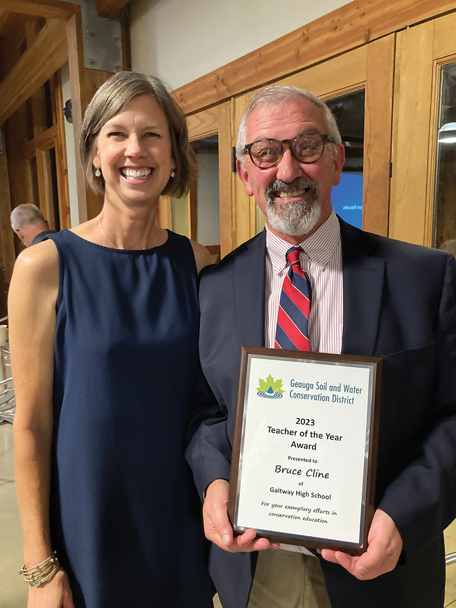 Geauga SWCD’s Education Specialist, Gail Prunty (left), recognized Bruce Cline of Gaitway High School (right) as the 2023 Conservation Teacher of the Year for his exemplary efforts, accomplishments, and commitment to conservation. (Submitted photo)