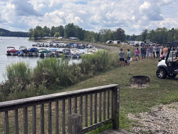 Campers and weekend visitors to Atwood Lake watch search efforts for Marcus and Vincen Miller near a dock on Aug. 23. (Submitted photo)
