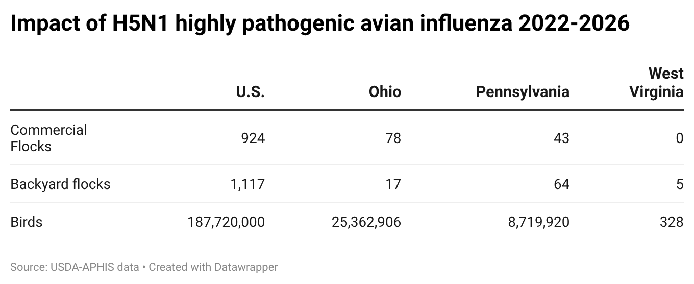The disease has been detected in Pennsylvania, Ohio and West Virginia in wild and domestic birds over the past several months, mostly in backyard flocks, although a case was reported Jan. 28 in a flock of 1.5 million egg-laying hens in Lancaster County, Pennsylvania. Bird flu was also the suspected cause of 70 black vulture deaths in Clermont County, Ohio, and 400 snow geese deaths in Erie County, Pennsylvania, in December.