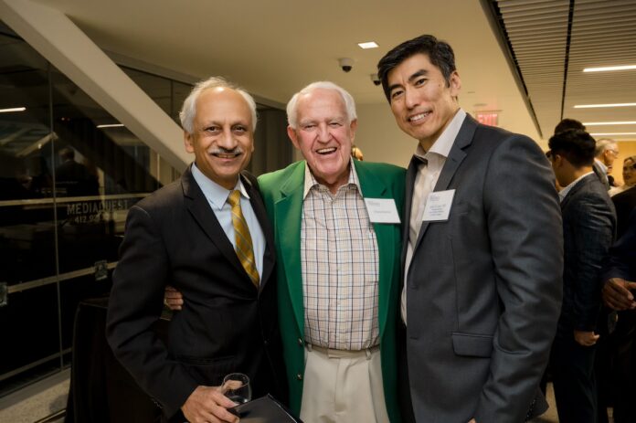 Dr. Anantha Shekhar, senior vice chancellor for the Health Sciences and the John and Gertrude Petersen Dean, School of Medicine, joins Hillandale Farms founder and University of Pittsburgh donor Orland Bethel and the director of the Bethel Musculoskeletal Research Center, Dr. Joon Lee, at the announcement in October 2023 of the Bethel gift that launched the center. Mr. Bethel’s newest gift of $18.5 million for a biobank brings his family’s total donation for this cause to $45 million-plus. (Joe Appel/University of Pittsburgh)