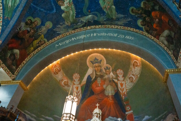 Other paintings speak to the harm caused by World War II and Vanka’s anti-war perspective, including “The Croatian Mother Raises Her Son For War,” where mothers wear Croatian mourning dresses and weep over an open casket surrounded by a field of unmarked gravestones, and “Christ on the Battlefield,” where soldiers stab a crucified Jesus. In another painting, “Mary on the Battlefield,” Mary is seen bending the bayonets of attacking soldiers.