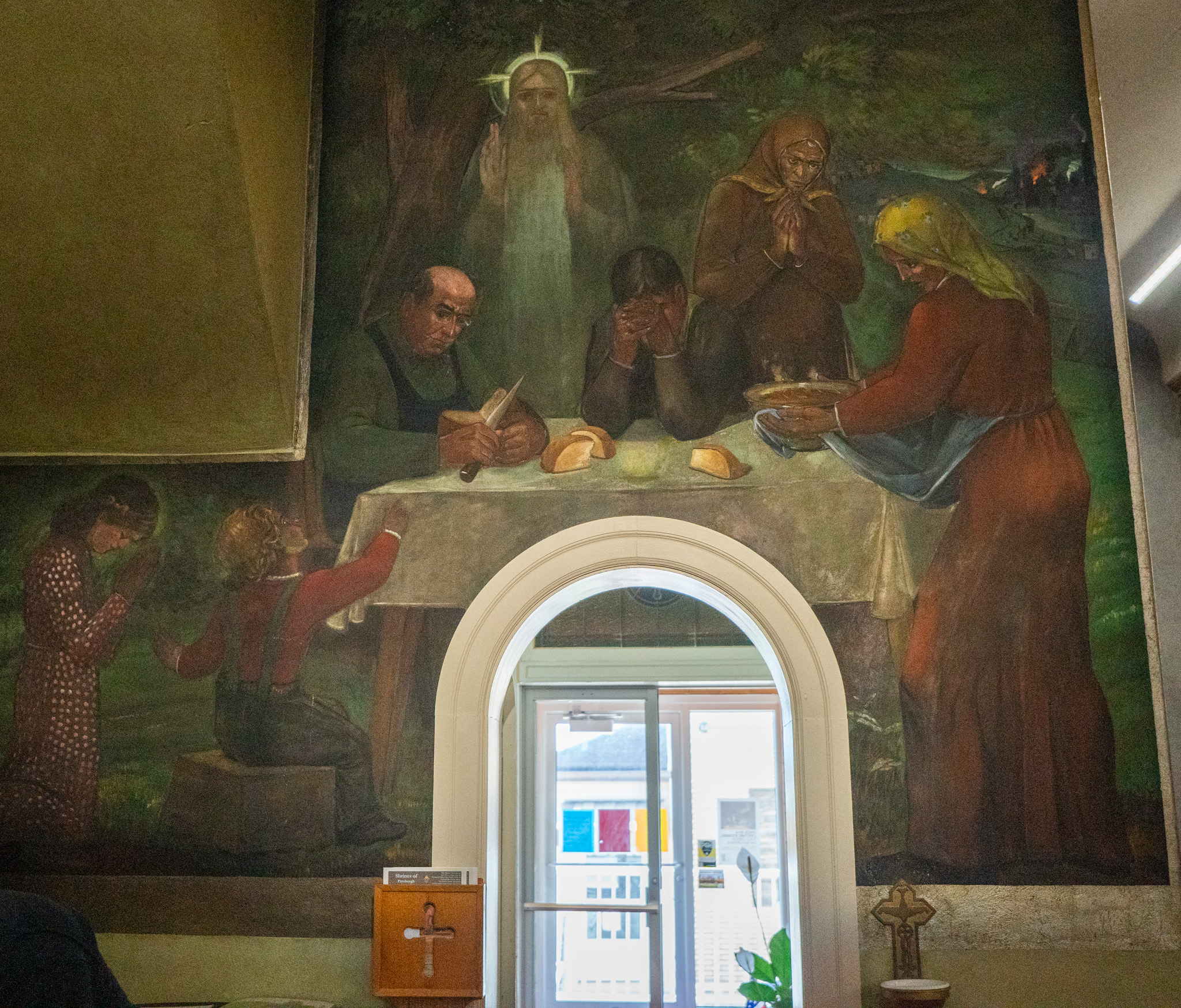 In total, Vanka painted 25 murals in the church that blend traditional depictions of the crucifixion and pieta with the immigrant experience in America during the industrial revolution and war. Some of the murals are based on real-life incidents. Vanka painted “Immigrant Mothers Raise Their Sons for American Industry” after a coal mining accident in Johnstown, Pennsylvania.
