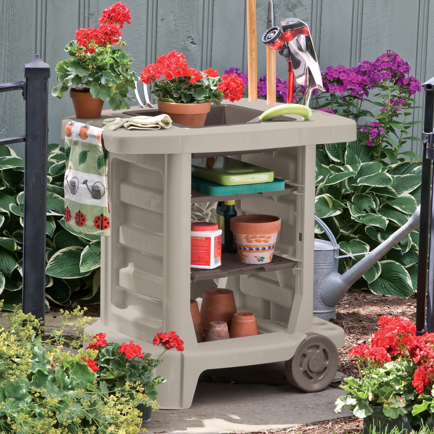 This includes a bin for mixing soil, vented shelves, slots for gardening tools and wheels for portability. This cart is a handy workstation for $74.88.