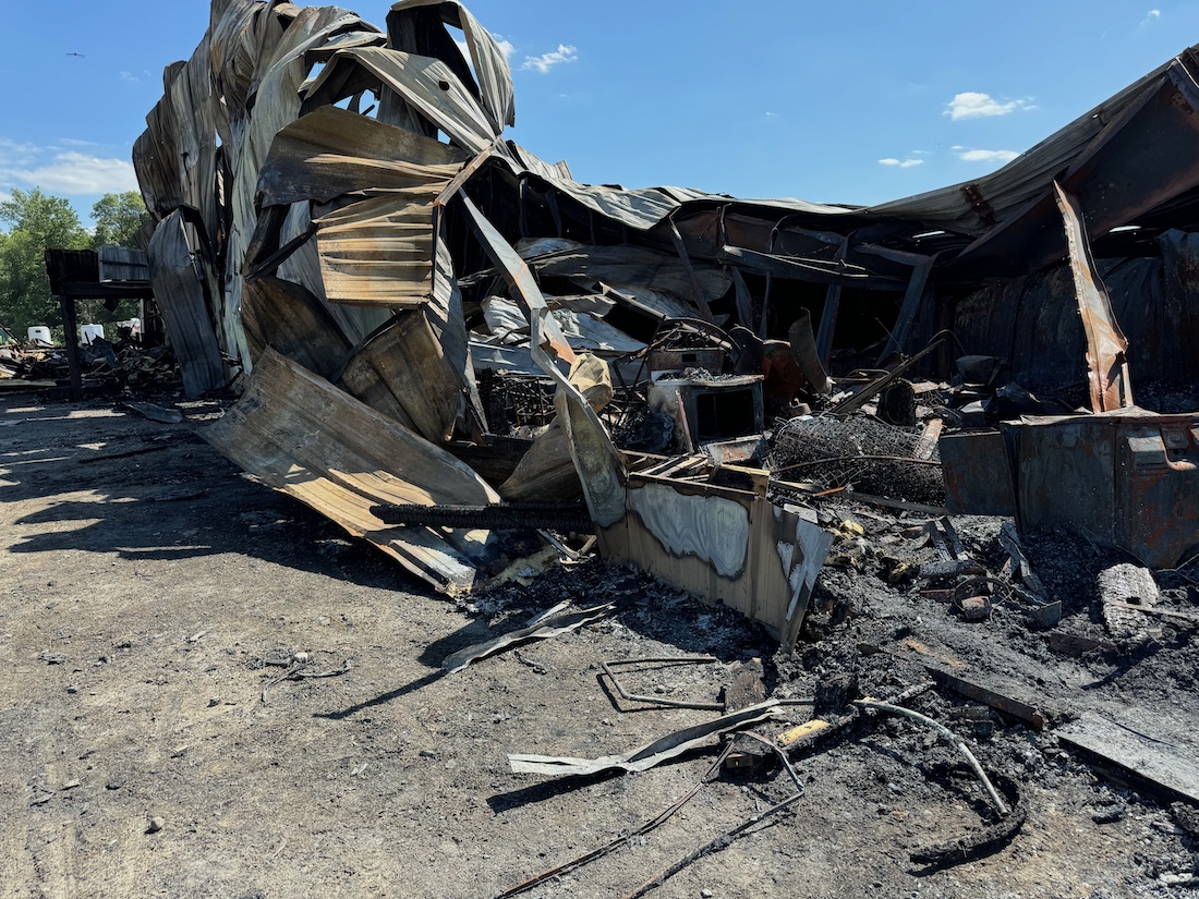 The acrid, throat-irritating smoke is still arising from various areas around the barn on June 11. Remnants of gates, stall walls, a bicycle and a burned out automobile dot the area around the perimeter of the once rather stately barn.