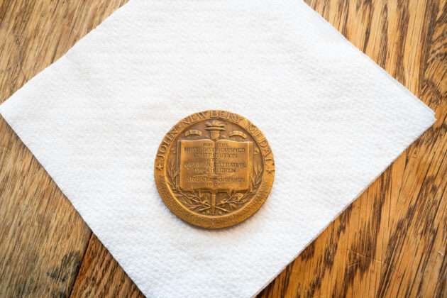 Woods, however, is most proud of one artifact in particular: Sorsensen’s Newbery Medal. She was gifted the medal by Sorensen’s son Fred, but locating him wasn’t easy. She first tried contacting all the Fred Sorsensens in Hendersonville, North Carolina. After this was unsuccessful, she reached out to Mary Lythgoe Bradford, an unofficial biographer of Sorensen.