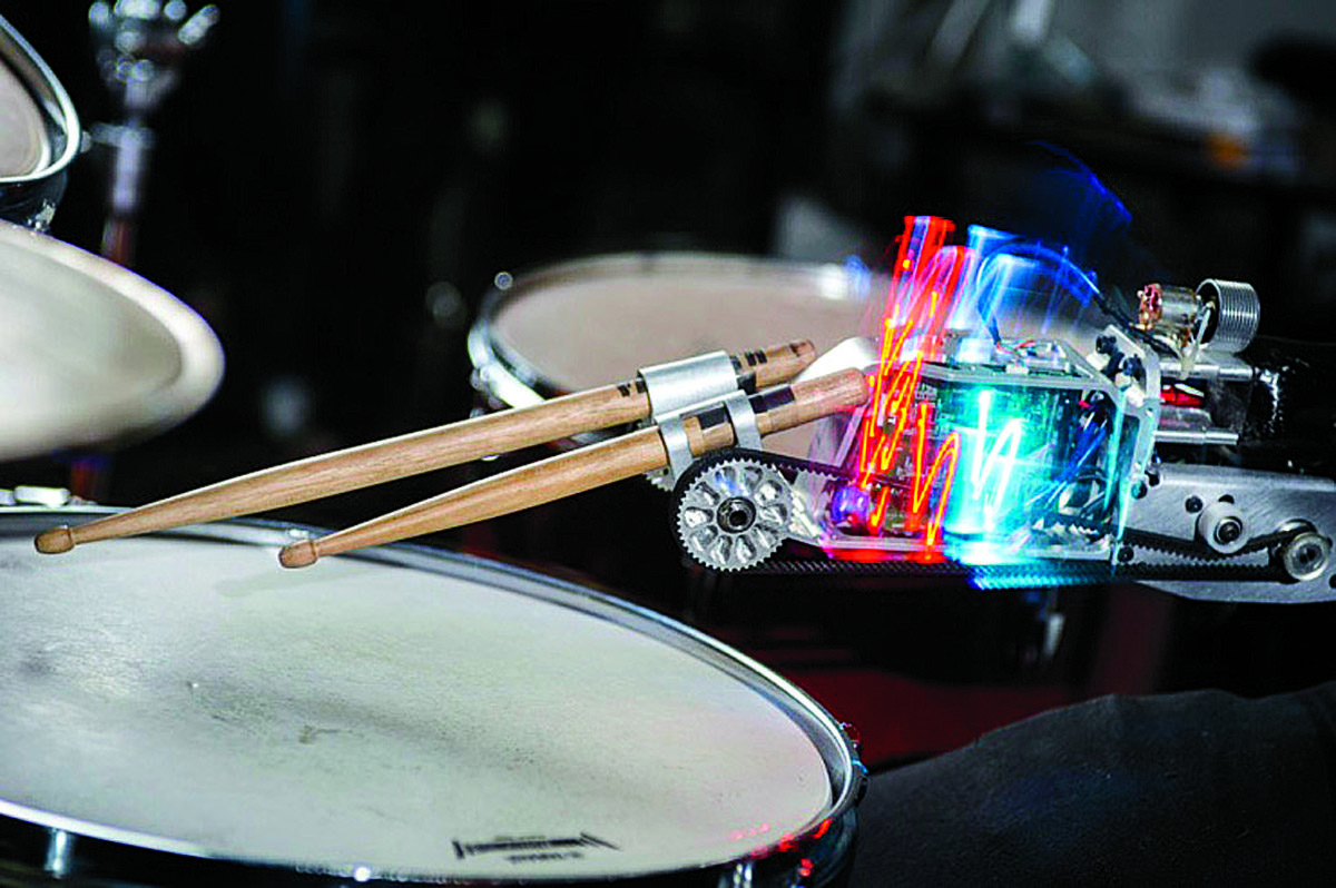 The robotic drumming prosthesis has motors that power two drumsticks. The first stick is controlled both physically by the musicians’ arms and electronically using electromyography (EMG) muscle sensors.