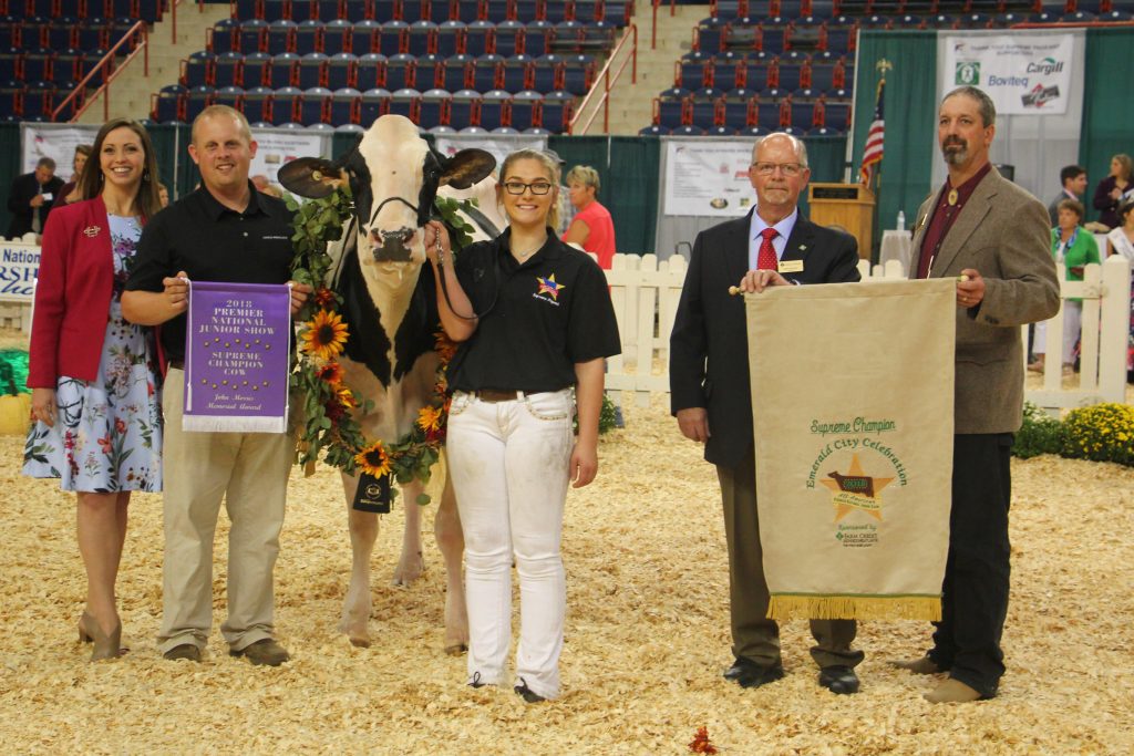 HARRISBURG, Pa. — Brooke Carey, of Titusville, Crawford County, showed her 4-year-old Holstein, Plum-Line Reginald Velovr, to win the title of supreme champion cow, Sept. 17, during the 2018 Premier National Junior Show in Harrisburg.
