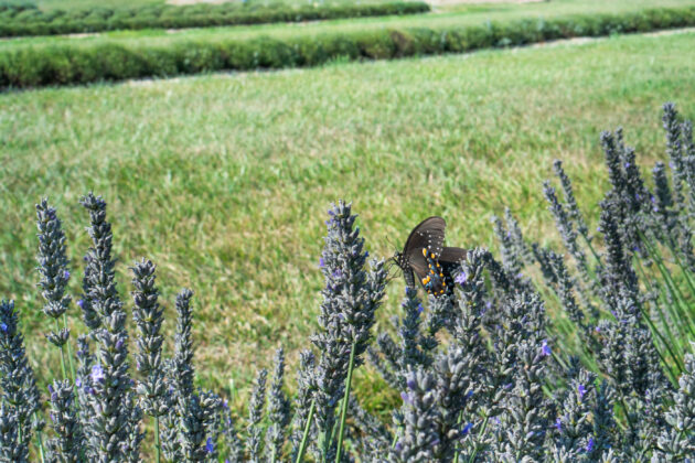 A butterfly rests on a lavender bush at Lavender Meadows farm on Aug. 1, 2024. (Liz Partsch photo)
