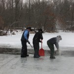 Young ladies bringing hot drinks and doughnuts for the working crew were interested in firing cakes of ice across the pond. I don’t know if they got into the act or not, but in past years I have seen some of them do better than hold their own, rapid firing cakes of ice to the shore.